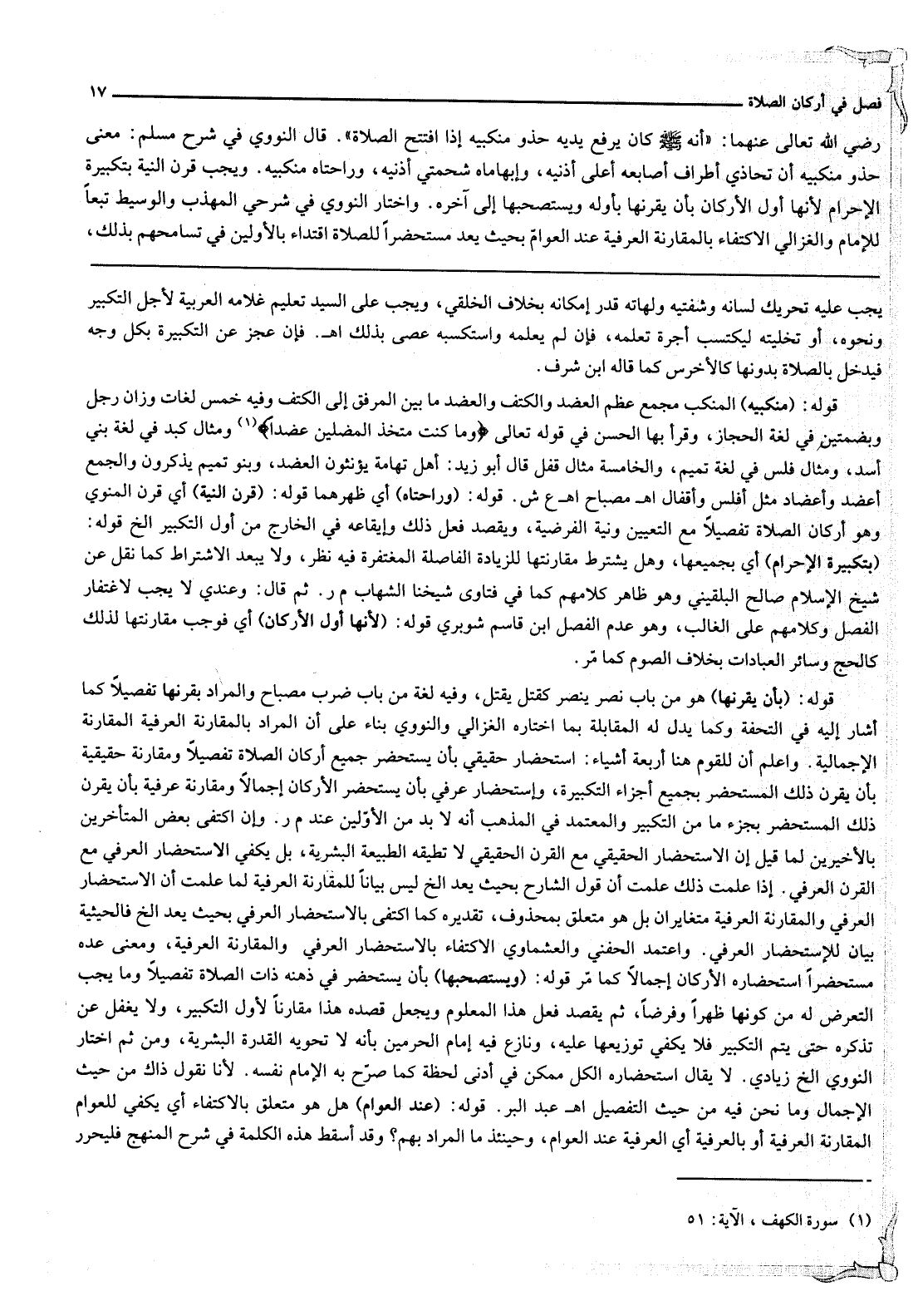 وَيَجِبُ قَرْنُ النِّيَّةِ بِتَكْبِيرَةِ الْإِحْرَامِ لِأَنَّهَا أَوَّلُ الْأَرْكَانِ بِأَنْ يَقْرُنَهَا بِأَوَّلِهِ وَيَسْتَصْحِبَهَا إلَى آخِرِهِ. وَاخْتَارَ النَّوَوِيُّ فِي شَرْحَيْ الْمُهَذَّبِ وَالْوَسِيطِ تَبَعًا لِلْإِمَامِ وَالْغَزَالِيِّ الِاكْتِفَاءَ بِالْمُقَارَنَةِ الْعُرْفِيَّةِ عِنْدَ الْعَوَامّ بِحَيْثُ يُعَدُّ مُسْتَحْضِرًا لِلصَّلَاةِ اقْتِدَاءً بِالْأَوَّلِينَ فِي تَسَامُحِهِمْ بِذَلِكَ،