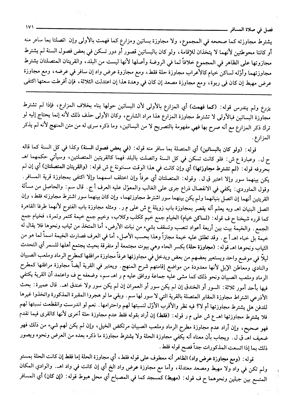 يُشْتَرَطُ مُجَاوَزَتُهُ كَمَا صَحَّحَهُ فِي الْمَجْمُوعِ، وَلَا مُجَاوَزَةُ بَسَاتِينَ وَمَزَارِعَ كَمَا فَهِمْت بِالْأَوْلَى وَإِنْ اتَّصَلَتَا بِمَا سَافَرَ مِنْهُ أَوْ كَانَتَا مَحُوطَتَيْنِ لِأَنَّهُمَا لَا يُتَّخَذَانِ لِلْإِقَامَةِ، وَلَوْ كَانَ بِالْبَسَاتِينِ قُصُورٌ أَوْ دُورٌ تُسْكَنُ فِي بَعْضِ فُصُولِ السَّنَةِ لَمْ يُشْتَرَطْ مُجَاوَزَتُهَا عَلَى الظَّاهِرِ فِي الْمَجْمُوعِ خِلَافًا لِمَا فِي الرَّوْضَةِ وَأَصْلِهَا لِأَنَّهَا لَيْسَتْ مِنْ الْبَلَدِ، وَالْقَرْيَتَانِ الْمُتَّصِلَتَانِ يُشْتَرَطُ مُجَاوَزَتُهُمَا وَأَوَّلُهُ لِسَاكِنِ خِيَامٍ كَالْأَعْرَابِ مُجَاوَزَةُ حِلَّةٍ فَقَطْ، وَمَعَ مُجَاوَزَةِ عَرْضِ وَادٍ إنْ سَافَرَ فِي عَرْضِهِ، وَمَعَ مُجَاوَزَةِ عَرْضِ مَهْبِطٍ إنْ كَانَ فِي رَبْوَةٍ، وَمَعَ مُجَاوَزَةِ مِصْعَدٍ إنْ كَانَ فِي وَهْدَةٍ هَذَا إنْ اعْتَدَلَتْ الثَّلَاثَةُ، فَإِنْ أَفْرَطَتْ سَعَتُهَا اكْتَفَى