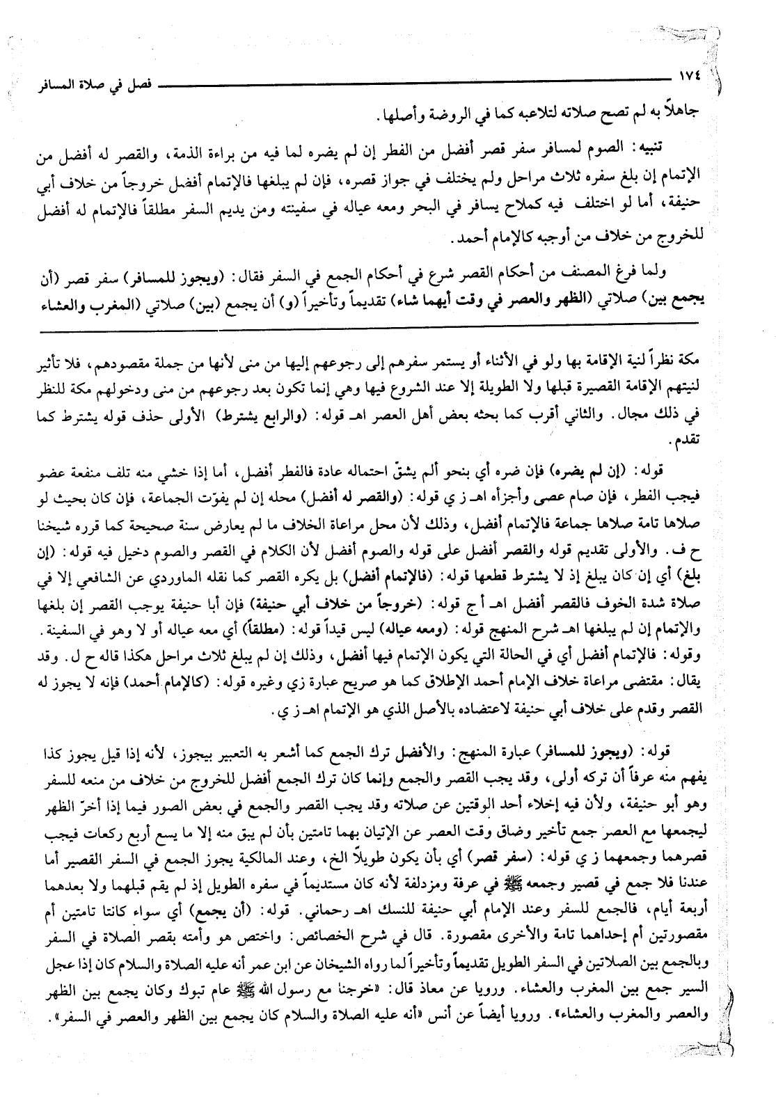 وَقَوْلُهُ: فَالْإِتْمَامُ أَفْضَلُ أَيْ فِي الْحَالَةِ الَّتِي يَكُونُ الْإِتْمَامُ فِيهَا أَفْضَلَ، وَذَلِكَ إنْ لَمْ يَبْلُغْ ثَلَاثَ مَرَاحِلَ هَكَذَا قَالَهُ ح ل. وَقَدْ يُقَالُ: مُقْتَضَى مُرَاعَاةِ خِلَافِ الْإِمَامِ أَحْمَدَ الْإِطْلَاقُ كَمَا هُوَ صَرِيحُ عِبَارَةِ ز ي وَغَيْرِهِ قَوْلُهُ: (كَالْإِمَامِ أَحْمَدَ) فَإِنَّهُ لَا يُجَوِّزُ لَهُ الْقَصْرُ وَقُدِّمَ عَلَى خِلَافِ أَبِي حَنِيفَةَ لِاعْتِضَادِهِ بِالْأَصْلِ الَّذِي هُوَ الْإِتْمَامُ. اهـ. ز ي.