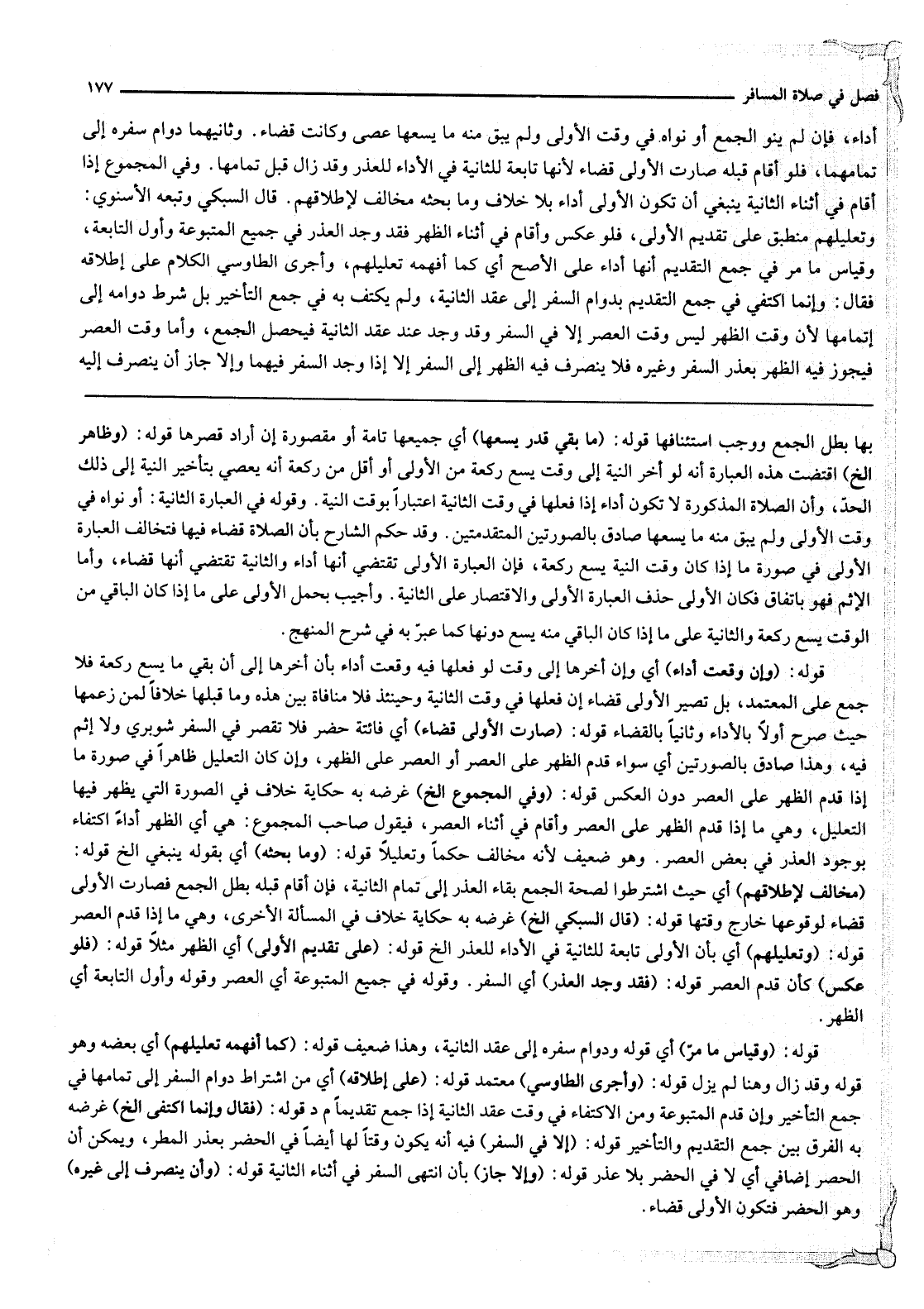 أَدَاءً، فَإِنْ لَمْ يَنْوِ الْجَمْعَ أَوْ نَوَاهُ فِي وَقْتِ الْأُولَى وَلَمْ يَبْقَ مِنْهُ مَا يَسَعُهَا عَصَى وَكَانَتْ قَضَاءً. وَثَانِيهِمَا دَوَامُ سَفَرِهِ إلَى تَمَامِهِمَا، فَلَوْ أَقَامَ قَبْلَهُ صَارَتْ الْأُولَى قَضَاءً لِأَنَّهَا تَابِعَةٌ لِلثَّانِيَةِ فِي الْأَدَاءِ لِلْعُذْرِ وَقَدْ زَالَ قَبْلَ تَمَامِهَا وَفِي الْمَجْمُوعِ إذَا أَقَامَ فِي أَثْنَاءِ الثَّانِيَةِ يَنْبَغِي أَنْ تَكُونَ الْأُولَى أَدَاءً بِلَا خِلَافٍ وَمَا بَحَثَهُ مُخَالِفٌ لِإِطْلَاقِهِمْ قَالَ السُّبْكِيُّ وَتَبِعَهُ الْإِسْنَوِيُّ: وَتَعْلِيلُهُمْ مُنْطَبِقٌ عَلَى تَقْدِيمِ الْأُولَى، فَلَوْ عَكَسَ وَأَقَامَ فِي أَثْنَاءِ الظُّهْرِ فَقَدْ وُجِدَ الْعُذْرُ فِي جَمِيعِ الْمَتْبُوعَةِ وَأَوَّلِ التَّابِعَةِ، وَقِيَاسُ مَا مَرَّ فِي جَمْعِ التَّقْدِيمِ أَنَّهَا أَدَاءٌ عَلَى الْأَصَحِّ أَيْ كَمَا أَفْهَمَهُ تَعْلِيلُهُمْ، وَأَجْرَى الطَّاوُسِيُّ الْكَلَامَ عَلَى إطْلَاقِهِ فَقَالَ: وَإِنَّمَا اُكْتُفِيَ فِي جَمْعِ التَّقْدِيمِ بِدَوَامِ السَّفَرِ إلَى عَقْدِ الثَّانِيَةِ، وَلَمْ يَكْتَفِ بِهِ فِي جَمْعِ التَّأْخِيرِ بَلْ شَرَطَ دَوَامَهُ إلَى إتْمَامِهَا لِأَنَّ وَقْتَ الظُّهْرِ لَيْسَ وَقْتَ الْعَصْرِ إلَّا فِي السَّفَرِ وَقَدْ وُجِدَ عِنْدَ عَقْدِ الثَّانِيَةِ فَيَحْصُلُ الْجَمْعُ، وَأَمَّا وَقْتُ الْعَصْرِ فَيَجُوزُ فِيهِ الظُّهْرُ بِعُذْرِ السَّفَرِ وَغَيْرِهِ فَلَا يَنْصَرِفُ فِيهِ الظُّهْرُ إلَى السَّفَرِ إلَّا إذَا وُجِدَ السَّفَرُ فِيهِمَا وَإِلَّا جَازَ أَنْ يَنْصَرِفَ إلَيْهِ