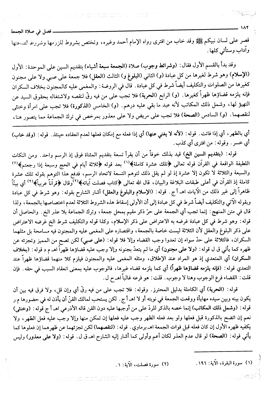 قَوْلُهُ: (الْحُرِّيَّةُ) أَيْ الْكَامِلَةُ بِدَلِيلِ الْمُحْتَرَزِ. وَقَوْلُهُ: فَلَا تَجِبُ عَلَى مَنْ فِيهِ رِقٌّ أَيْ وَإِنْ قَلَّ، وَلَا فَرْقَ فِيهِ بَيْنَ أَنْ يَكُونَ بَيْنَهُ وَبَيْنَ سَيِّدِهِ مُهَايَأَةٌ وَوَقَعَتْ الْجُمُعَةُ فِي نَوْبَتِهِ أَوْ لَا اهـ أج. لَكِنْ يُسْتَحَبُّ لِمَالِكِ الْقِنِّ أَنْ يَأْذَنَ لَهُ فِي حُضُورِهَا م ر قَوْلُهُ: (وَشَمِلَ ذَلِكَ الْمُكَاتَبَ) إنَّمَا خَصَّهُ بِالذِّكْرِ لِلرَّدِّ عَلَى مَنْ أَوْجَبَهَا عَلَيْهِ دُونَ الْقِنِّ قَالَهُ الْأَذْرَعِيُّ اهـ أج قَوْلُهُ: (وَخُنْثَى) نَعَمْ إنْ اتَّضَحَ بِالذُّكُورَةِ قَبْلَ فِعْلِهَا وَلَوْ بَعْدَ فِعْلِهِ الظُّهْرَ وَجَبَ عَلَيْهِ فِعْلُهَا إنْ تَمَكَّنَ مِنْهَا وَإِلَّا وَجَبَ عَلَيْهِ فِعْلُ الظُّهْرِ، وَلَا يَكْفِيه ظُهْرُهُ الْأَوَّلُ إنْ كَانَ فَعَلَهُ قَبْلَ فَوَاتِ الْجُمُعَةِ. اهـ. بِرْمَاوِيٌّ.