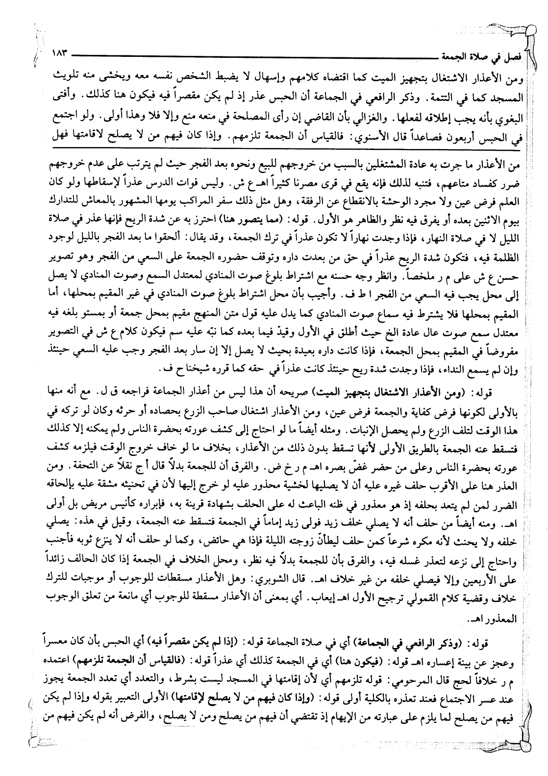 وَمِنْ الْأَعْذَارِ الِاشْتِغَالُ بِتَجْهِيزِ الْمَيِّتِ كَمَا اقْتَضَاهُ كَلَامُهُمْ وَإِسْهَالٌ لَا يَضْبِطُ الشَّخْصُ نَفْسَهُ مَعَهُ وَيَخْشَى مِنْهُ تَلْوِيثَ الْمَسْجِدِ كَمَا فِي التَّتِمَّةِ وَذَكَرَ الرَّافِعِيُّ فِي الْجَمَاعَةِ أَنَّ الْحَبْسَ عُذْرٌ إذْ لَمْ يَكُنْ مُقَصِّرًا فِيهِ فَيَكُونُ هُنَا كَذَلِكَ وَأَفْتَى الْبَغَوِيّ بِأَنَّهُ يَجِبُ إطْلَاقُهُ لِفِعْلِهَا وَالْغَزَالِيُّ بِأَنَّ الْقَاضِيَ إنْ رَأَى الْمَصْلَحَةَ فِي مَنْعِهِ مُنِعَ وَإِلَّا فَلَا وَهَذَا أَوْلَى وَلَوْ اجْتَمَعَ فِي الْحَبْسِ أَرْبَعُونَ فَصَاعِدًا قَالَ الْإِسْنَوِيُّ: فَالْقِيَاسُ أَنَّ الْجُمُعَةَ تَلْزَمُهُمْ.