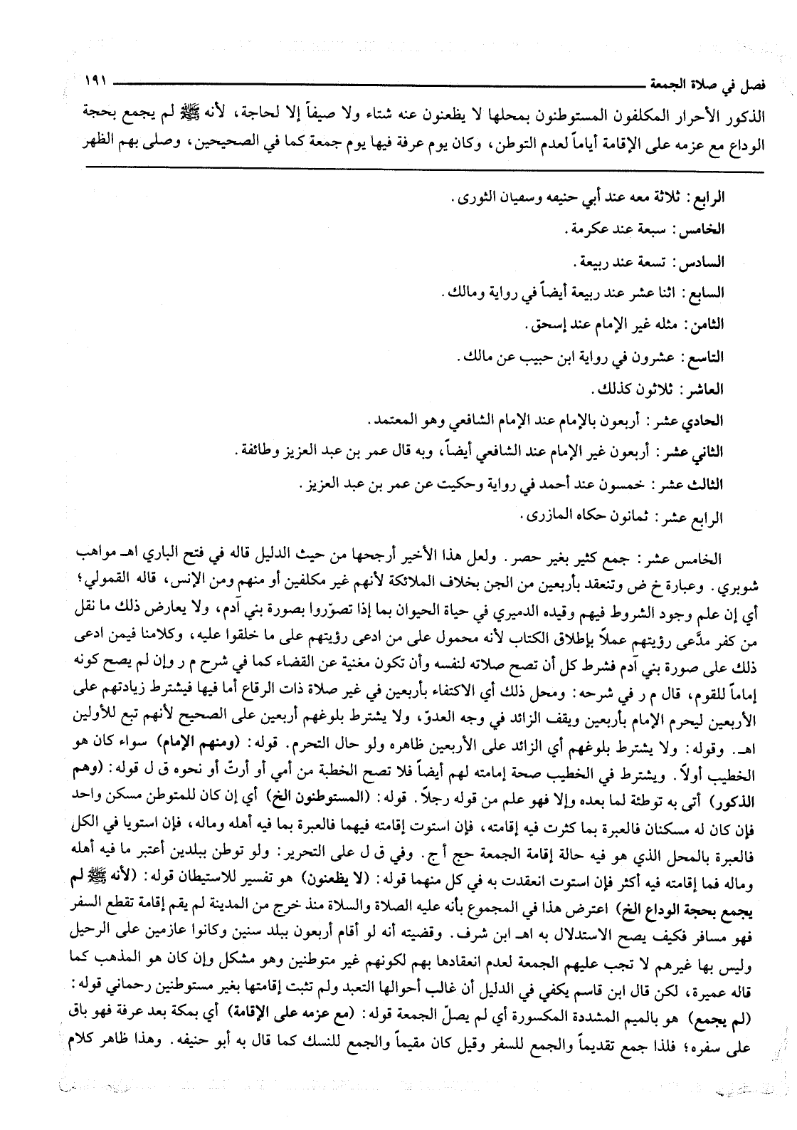 الْخَامِسَ عَشَرَ: جَمْعٌ كَثِيرٌ بِغَيْرِ حَصْرٍ. وَلَعَلَّ هَذَا الْأَخِيرَ أَرْجَحُهَا مِنْ حَيْثُ الدَّلِيلِ قَالَهُ فِي فَتْحِ الْبَارِي اهـ مَوَاهِبُ شَوْبَرِيٌّ. وَعِبَارَةُ خ ض وَتَنْعَقِدُ بِأَرْبَعِينَ مِنْ الْجِنِّ بِخِلَافِ الْمَلَائِكَةِ لِأَنَّهُمْ غَيْرُ مُكَلَّفِينَ أَوْ مِنْهُمْ وَمِنْ الْإِنْسِ، قَالَهُ الْقَمُولِيُّ؛ أَيْ إنْ عَلِمَ وُجُودَ الشُّرُوطِ فِيهِمْ وَقَيَّدَهُ الدَّمِيرِيُّ فِي حَيَاةِ الْحَيَوَانِ بِمَا إذَا تَصَوَّرُوا بِصُورَةِ بَنِي آدَمَ، وَلَا يُعَارِضُ ذَلِكَ مَا نُقِلَ مِنْ كُفْرِ مُدَّعِي رُؤْيَتِهِمْ عَمَلًا بِإِطْلَاقِ الْكِتَابِ لِأَنَّهُ مَحْمُولٌ عَلَى مَنْ ادَّعَى رُؤْيَتَهُمْ عَلَى مَا خُلِقُوا عَلَيْهِ، وَكَلَامُنَا فِيمَنْ ادَّعَى ذَلِكَ عَلَى صُورَةِ بَنِي آدَمَ فَشَرْطُ كُلٍّ أَنْ تَصِحَّ صَلَاتُهُ لِنَفْسِهِ وَأَنْ تَكُونَ مُغْنِيَةً عَنْ الْقَضَاءِ كَمَا فِي شَرْحِ م ر وَإِنْ لَمْ يَصِحَّ كَوْنُهُ إمَامًا لِلْقَوْمِ، قَالَ م ر فِي شَرْحِهِ: وَمَحَلُّ ذَلِكَ أَيْ الِاكْتِفَاءِ بِأَرْبَعِينَ فِي غَيْرِ صَلَاةِ ذَاتِ الرِّقَاعِ أَمَّا فِيهَا فَيُشْتَرَطُ زِيَادَتُهُمْ عَلَى الْأَرْبَعِينَ لِيُحْرِمَ الْإِمَامُ بِأَرْبَعِينَ وَيَقِفَ الزَّائِدُ فِي وَجْهِ الْعَدُوِّ، وَلَا يُشْتَرَطُ بُلُوغُهُمْ أَرْبَعِينَ عَلَى الصَّحِيحِ لِأَنَّهُمْ تَبَعٌ لِلْأَوَّلِينَ اهـ. وَقَوْلُهُ: وَلَا يُشْتَرَطُ بُلُوغُهُمْ أَيْ الزَّائِدُ عَلَى الْأَرْبَعِينَ ظَاهِرُهُ وَلَوْ حَالَ التَّحَرُّمِ.