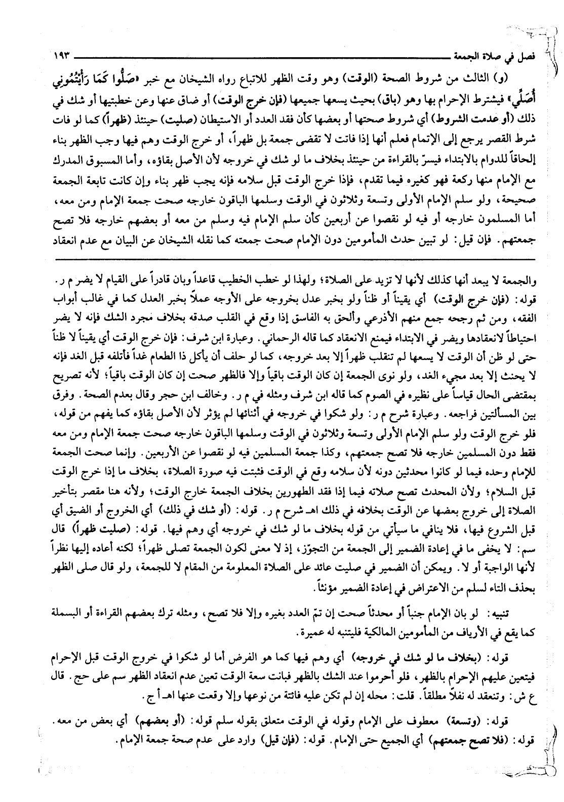 (وَ) الثَّالِثُ مِنْ شُرُوطِ الصِّحَّةِ (الْوَقْتُ) وَهُوَ وَقْتُ الظُّهْرِ لِلِاتِّبَاعِ رَوَاهُ الشَّيْخَانِ مَعَ خَبَرِ «صَلُّوا كَمَا رَأَيْتُمُونِي أُصَلِّي» فَيُشْتَرَطُ الْإِحْرَامُ بِهَا وَهُوَ (بَاقٍ) بِحَيْثُ يَسَعُهَا جَمِيعَهَا. (فَإِنْ خَرَجَ الْوَقْتُ) أَوْ ضَاقَ عَنْهَا وَعَنْ خُطْبَتَيْهَا أَوْ شَكَّ فِي ذَلِكَ (أَوْ عُدِمَتْ الشُّرُوطُ) أَيْ شُرُوطُ صِحَّتِهَا أَوْ بَعْضُهَا كَأَنْ فُقِدَ الْعَدَدُ أَوْ الِاسْتِيطَانُ (صُلِّيَتْ) حِينَئِذٍ (ظُهْرًا) كَمَا لَوْ فَاتَ شَرْطُ الْقَصْرِ يَرْجِعُ إلَى الْإِتْمَامِ فَعُلِمَ أَنَّهَا إذَا فَاتَتْ لَا تُقْضَى جُمُعَةً بَلْ ظُهْرًا، أَوْ خَرَجَ الْوَقْتُ وَهُمْ فِيهَا وَجَبَ الظُّهْرُ بِنَاءً إلْحَاقًا لِلدَّوَامِ بِالِابْتِدَاءِ فَيُسِرُّ بِالْقِرَاءَةِ مِنْ حِينَئِذٍ بِخِلَافِ مَا لَوْ شَكَّ فِي خُرُوجِهِ لِأَنَّ الْأَصْلَ بَقَاؤُهُ، وَأَمَّا الْمَسْبُوقُ الْمُدْرِكُ مَعَ الْإِمَامِ مِنْهَا رَكْعَةً فَهُوَ كَغَيْرِهِ فِيمَا تَقَدَّمَ. فَإِذَا خَرَجَ الْوَقْتُ قَبْلَ سَلَامِهِ فَإِنَّهُ يَجِبُ ظُهْرٌ بِنَاءً وَإِنْ كَانَتْ تَابِعَةُ الْجُمُعَةِ صَحِيحَةً، وَلَوْ سَلَّمَ الْإِمَامُ الْأُولَى وَتِسْعَةٌ وَثَلَاثُونَ فِي الْوَقْتِ وَسَلَّمَهَا الْبَاقُونَ خَارِجَهُ صَحَّتْ جُمُعَةُ الْإِمَامِ وَمَنْ مَعَهُ، أَمَّا الْمُسَلِّمُونَ خَارِجَهُ أَوْ فِيهِ لَوْ نَقَصُوا عَنْ أَرْبَعِينَ كَأَنْ سَلَّمَ الْإِمَامُ فِيهِ وَسَلَّمَ مَنْ مَعَهُ أَوْ بَعْضُهُمْ خَارِجَهُ فَلَا تَصِحُّ جُمُعَتُهُمْ فَإِنْ قِيلَ: لَوْ تَبَيَّنَ حَدَثُ الْمَأْمُومِينَ دُونَ الْإِمَامِ صَحَّتْ جُمُعَتُهُ كَمَا نَقَلَهُ الشَّيْخَانِ عَنْ الْبَيَانِ مَعَ عَدَمِ انْعِقَادِ