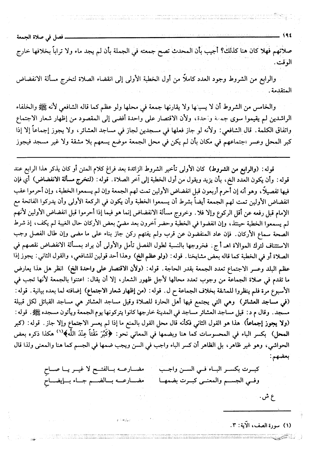 وَالْخَامِسُ مِنْ الشُّرُوطِ أَنْ لَا يَسْبِقَهَا وَلَا يُقَارِنَهَا جُمُعَةٌ فِي مَحَلِّهَا وَلَوْ عَظُمَ كَمَا قَالَهُ الشَّافِعِيُّ لِأَنَّهُ - صَلَّى اللَّهُ عَلَيْهِ وَسَلَّمَ - وَالْخُلَفَاءُ الرَّاشِدِينَ لَمْ يُقِيمُوا سِوَى جُمُعَةٍ وَاحِدَةٍ، وَلِأَنَّ الِاقْتِصَارَ عَلَى وَاحِدَةٍ أَفْضَى إلَى الْمَقْصُودِ مِنْ إظْهَارِ شِعَارِ الِاجْتِمَاعِ وَاتِّفَاقِ الْكَلِمَةِ قَالَ الشَّافِعِيُّ: وَلِأَنَّهُ لَوْ جَازَ فِعْلُهَا فِي مَسْجِدَيْنِ لَجَازَ فِي مَسَاجِدِ الْعَشَائِرِ، وَلَا يَجُوزُ إجْمَاعًا إلَّا إذَا كَبُرَ الْمَحَلُّ وَعَسُرَ اجْتِمَاعُهُمْ فِي مَكَان بِأَنْ لَمْ يَكُنْ فِي مَحَلِّ الْجُمُعَةِ مَوْضِعٌ يَسَعُهُمْ بِلَا مَشَقَّةٍ وَلَا غَيْرَ مَسْجِدٍ فَيَجُوزُ