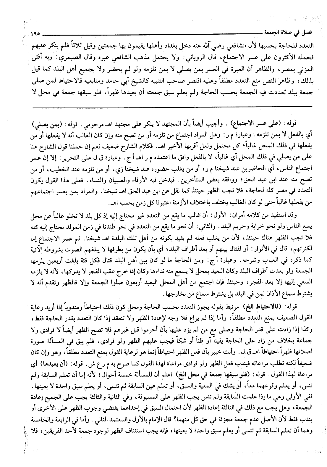 وَقَدْ اُسْتُفِيدَ مِنْ كَلَامِهِ أَمْرَانِ: الْأَوَّلُ: أَنَّ غَالِبَ مَا يَقَعُ مِنْ التَّعَدُّدِ غَيْرُ مُحْتَاجٍ إلَيْهِ إذْ كُلُّ بَلَدٍ لَا تَخْلُو غَالِبًا عَنْ مَحَلٍّ يَسَعُ النَّاسَ وَلَوْ نَحْوَ خَرَابَةٍ وَحَرِيمِ الْبَلَدِ. وَالثَّانِي: أَنَّ نَحْوَ مَا يَقَعُ مِنْ التَّعَدُّدِ فِي نَحْوِ طَنْدَتَا فِي زَمَنِ الْمَوْلِدِ مُحْتَاجٌ إلَيْهِ كُلِّهِ فَلَا تَجِبُ الظُّهْرُ هُنَاكَ حِينَئِذٍ، لِأَنَّ مَنْ يَغْلِبُ فِعْلُهُ لَمْ يُقَيِّدْ بِكَوْنِهِ مِنْ أَهْلِ تِلْكَ الْبَلْدَةِ. اهـ. شَيْخُنَا. ثُمَّ عَسُرَ الِاجْتِمَاعُ إمَّا لِكَثْرَتِهِمْ، قَالَ فِي الْأَنْوَارِ: أَوْ لِقِتَالٍ بَيْنَهُمْ أَوْ بُعْدِ أَطْرَافِ الْبَلَدِ؛ أَيْ بِأَنْ يَكُونَ مَنْ بِطَرَفِهَا لَا يَبْلُغُهُمْ الصَّوْتُ بِشُرُوطِهِ الْآتِيَةِ كَمَا ذَكَرَهُ فِي الْعُبَابِ وَشَرْحِهِ. وَعِبَارَةُ أج: وَمِنْ الْحَاجَةِ مَا لَوْ كَانَ بَيْنَ أَهْلِ الْبَلَدِ قِتَالٌ فَكُلُّ فِئَةٍ بَلَغَتْ أَرْبَعِينَ يَلْزَمُهَا الْجُمُعَةُ وَلَوْ بَعُدَتْ أَطْرَافُ الْبَلَدِ وَكَانَ الْبَعِيدُ بِمَحَلٍّ لَا يَسْمَعُ مِنْهُ نِدَاءَهَا وَكَانَ إذَا خَرَجَ عَقِبَ الْفَجْرِ لَا يُدْرِكُهَا، لِأَنَّهُ لَا يَلْزَمُهُ السَّعْيُ إلَيْهَا إلَّا بَعْدَ الْفَجْرِ، وَحِينَئِذٍ فَإِنْ اجْتَمَعَ مِنْ أَهْلِ الْمَحَلِّ الْبَعِيدِ أَرْبَعُونَ صَلَّوْا الْجُمُعَةَ وَإِلَّا فَالظُّهْرَ وَتَقَدَّمَ أَنَّهُ لَا يُشْتَرَطُ سَمَاعُ الْأَذَانِ لِمَنْ فِي الْبَلَدِ بَلْ يُشْتَرَطُ سَمَاعُ مَنْ بِخَارِجِهَا.
