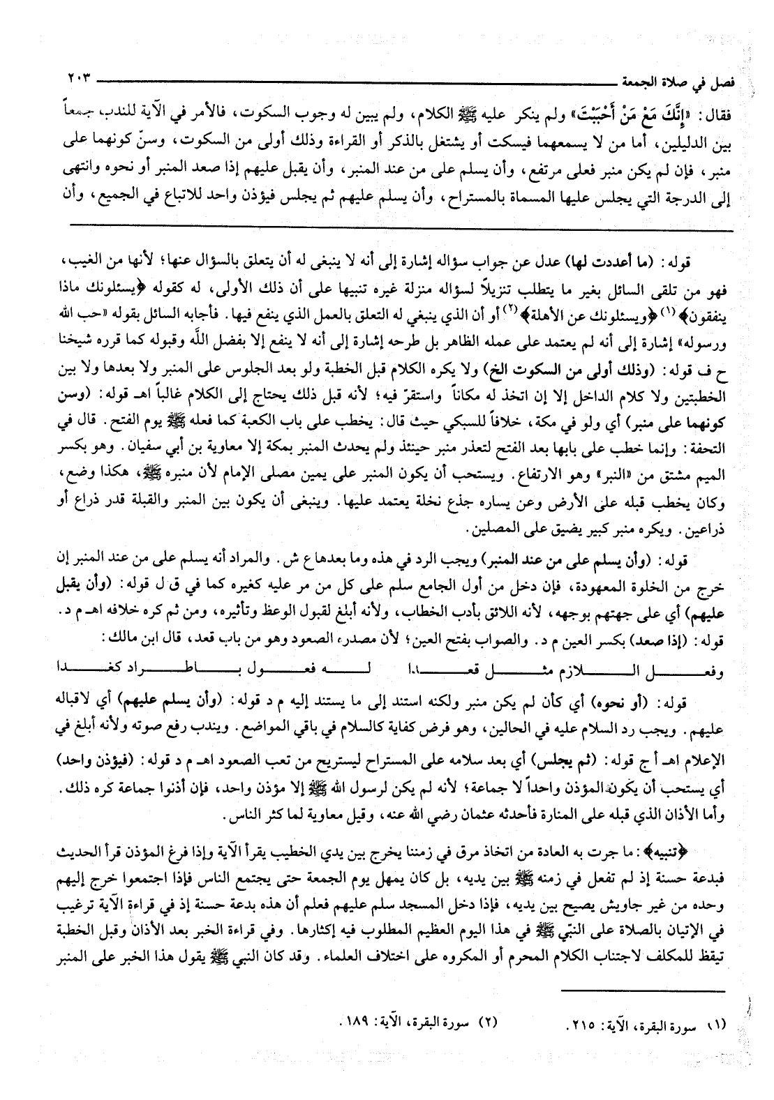 فَقَالَ: إنَّكَ مَعَ مَنْ أَحْبَبْتَ» وَلَمْ يُنْكِرْ عَلَيْهِ - صَلَّى اللَّهُ عَلَيْهِ وَسَلَّمَ - الْكَلَامَ، وَلَمْ يُبَيِّنْ لَهُ وُجُوبَ السُّكُوتِ، فَالْأَمْرُ فِي الْآيَةِ لِلنَّدَبِ جَمْعًا بَيْنَ الدَّلِيلَيْنِ، أَمَّا مَنْ لَا يَسْمَعُهُمَا فَيَسْكُتُ أَوْ يَشْتَغِلُ بِالذِّكْرِ أَوْ الْقِرَاءَةِ وَذَلِكَ أَوْلَى مِنْ السُّكُوتِ، وَسُنَّ كَوْنُهُمَا عَلَى مِنْبَرٍ، فَإِنْ لَمْ يَكُنْ مِنْبَرٌ فَعَلَى مُرْتَفِعٍ، وَأَنْ يُسَلِّمَ عَلَى مَنْ عِنْدَ الْمِنْبَرِ، وَأَنْ يُقْبِلَ عَلَيْهِمْ إذَا صَعِدَ الْمِنْبَرَ أَوْ نَحْوَهُ وَانْتَهَى إلَى الدَّرَجَةِ الَّتِي يَجْلِسُ عَلَيْهَا الْمُسَمَّاةِ بِالْمُسْتَرَاحِ، وَأَنْ يُسَلِّمَ عَلَيْهِمْ ثُمَّ يَجْلِسَ فَيُؤَذِّنَ وَاحِدٌ لِلِاتِّبَاعِ فِي الْجَمِيعِ، وَأَنْ