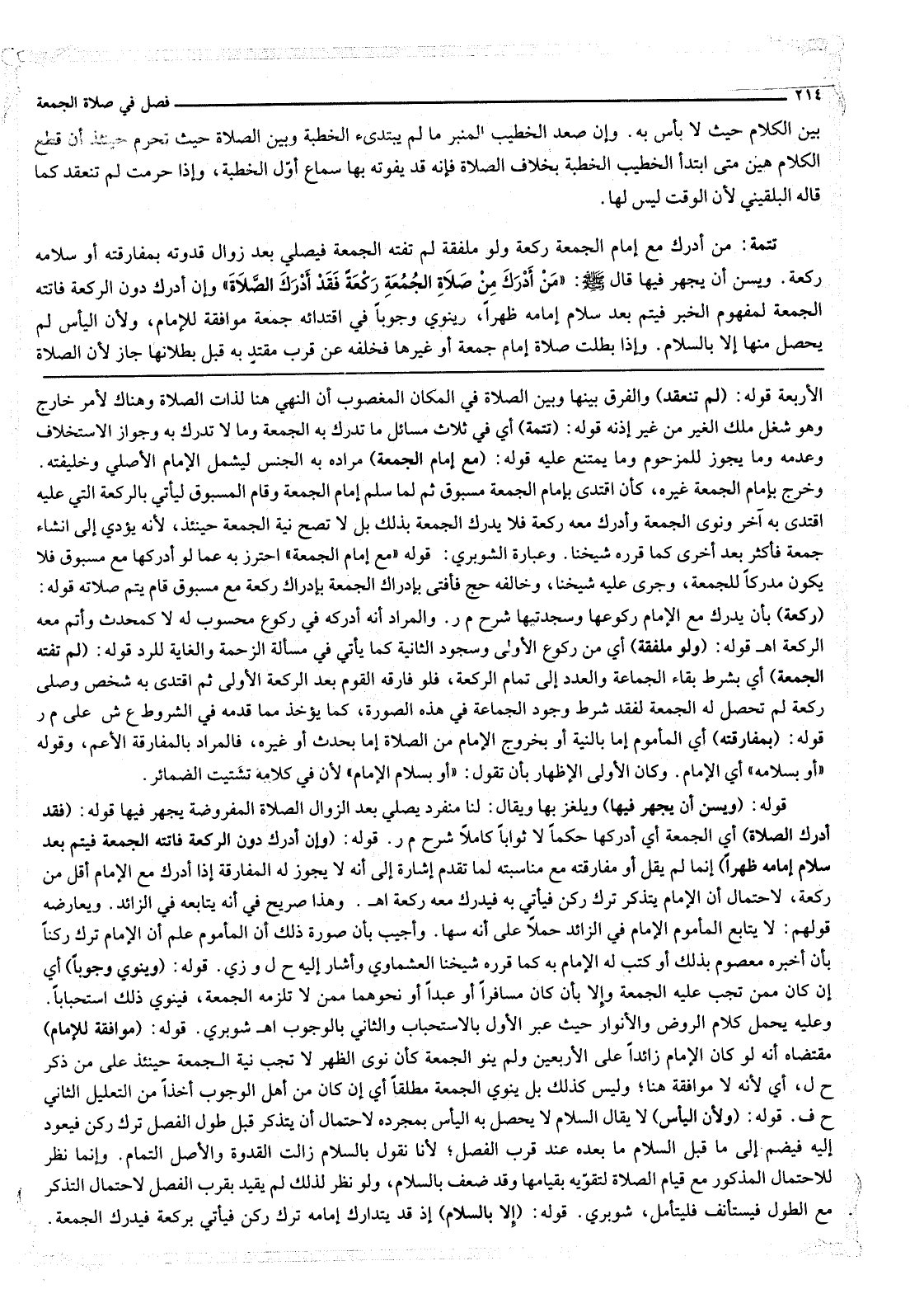 بَيْنَ الْكَلَامِ حَيْثُ لَا بَأْسَ بِهِ وَإِنْ صَعِدَ الْخَطِيبُ الْمِنْبَرَ مَا لَمْ يَبْتَدِئْ الْخُطْبَةَ وَبَيْنَ الصَّلَاةِ حَيْثُ تَحْرُمُ حِينَئِذٍ أَنَّ قَطْعَ الْكَلَامِ هَيِّنٌ مَتَى ابْتَدَأَ الْخَطِيبُ الْخُطْبَةَ بِخِلَافِ الصَّلَاةِ فَإِنَّهُ قَدْ يَفُوتُهُ بِهَا سَمَاعُ أَوَّلِ الْخُطْبَةِ، وَإِذَا حُرِّمَتْ لَمْ تَنْعَقِدْ كَمَا قَالَهُ الْبُلْقِينِيُّ لِأَنَّ الْوَقْتَ لَيْسَ لَهَا تَتِمَّةٌ: مَنْ أَدْرَكَ مَعَ إمَامِ الْجُمُعَةِ رَكْعَةً وَلَوْ مُلَفَّقَةً لَمْ تَفُتْهُ الْجُمُعَةُ فَيُصَلِّي بَعْدَ زَوَالِ قُدْوَتِهِ بِمُفَارَقَتِهِ أَوْ سَلَامِهِ رَكْعَةً وَيُسَنُّ أَنْ يَجْهَرَ فِيهَا قَالَ - صَلَّى اللَّهُ عَلَيْهِ وَسَلَّمَ -: «مَنْ أَدْرَكَ مِنْ صَلَاةِ الْجُمُعَةِ رَكْعَةً فَقَدْ أَدْرَكَ الصَّلَاةَ» وَإِنْ أَدْرَكَ دُونَ الرَّكْعَةِ فَاتَتْهُ الْجُمُعَةُ لِمَفْهُومِ الْخَبَرِ فَيُتِمُّ بَعْدَ سَلَامِ إمَامِهِ ظُهْرًا، وَيَنْوِي وُجُوبًا فِي اقْتِدَائِهِ جُمُعَةً مُوَافَقَةً لِلْإِمَامِ، وَلِأَنَّ الْيَأْسَ لَمْ يَحْصُلْ مِنْهَا إلَّا بِالسَّلَامِ.