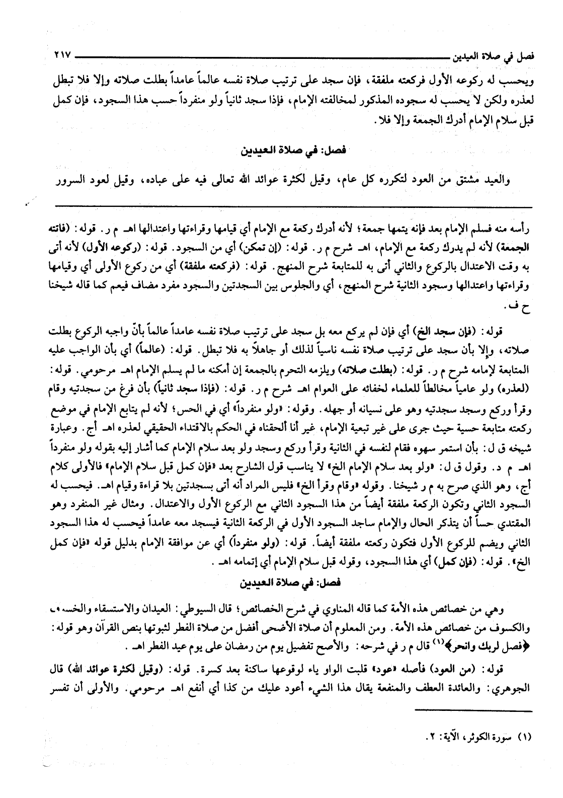 ِ وَهِيَ مِنْ خَصَائِصِ هَذِهِ الْأُمَّةِ كَمَا قَالَهُ الْمُنَاوِيُّ فِي شَرْحِ الْخَصَائِصِ؛ قَالَ السُّيُوطِيّ: الْعِيدَانِ وَالِاسْتِسْقَاءُ وَالْخُسُوفُ وَالْكُسُوفُ مِنْ خَصَائِصِ هَذِهِ الْأُمَّةِ. وَمِنْ الْمَعْلُومِ أَنَّ صَلَاةَ الْأَضْحَى أَفْضَلُ مِنْ صَلَاةِ الْفِطْرِ لِثُبُوتِهَا بِنَصِّ الْقُرْآنِ وَهُوَ قَوْلُهُ: {فَصَلِّ لِرَبِّكَ وَانْحَرْ} [الكوثر: 2] قَالَ م ر فِي شَرْحِهِ: وَالْأَصَحُّ تَفْضِيلُ يَوْمٍ مِنْ رَمَضَانَ عَلَى يَوْمِ عِيدِ الْفِطْرِ اهـ.