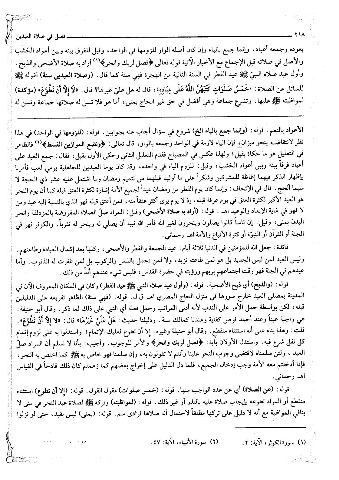 قَوْلُهُ: (أَرَادَ بِهِ صَلَاةَ الْأَضْحَى) وَقِيلَ: الْمُرَادُ صَلِّ الصَّلَاةَ الْمَفْرُوضَةَ بِالْمُزْدَلِفَةِ وَانْحَرْ الْبُدْنَ بِمِنًى، وَقِيلَ: إنَّ نَاسًا كَانُوا يُصَلُّونَ وَيَنْحَرُونَ لِغَيْرِ اللَّهِ فَأَمَرَ اللَّهُ نَبِيَّهُ أَنْ يُصَلِّيَ لَهُ وَيَنْحَرَ لَهُ تَقَرُّبًا. وَالْكَوْثَرُ نَهْرٌ فِي الْجَنَّةِ أَوْ الْقُرْآنُ أَوْ النُّبُوَّةُ أَوْ كَثْرَةُ الْأَتْبَاعِ وَالْأُمَّةِ. اهـ. رَحْمَانِيٌّ. فَائِدَةٌ: جَعَلَ اللَّهُ لِلْمُؤْمِنِينَ فِي الدُّنْيَا ثَلَاثَةَ أَيَّامٍ: عِيدَ الْجُمُعَةِ وَالْفِطْرِ وَالْأَضْحَى، وَكُلُّهَا بَعْدَ إكْمَالِ الْعِبَادَةِ وَطَاعَتِهِمْ. وَلَيْسَ الْعِيدُ لِمَنْ لَبِسَ الْجَدِيدَ بَلْ هُوَ لِمَنْ طَاعَتُهُ تَزِيدُ، وَلَا لِمَنْ تَجَمَّلَ بِاللُّبْسِ وَالرُّكُوبِ بَلْ لِمَنْ غُفِرَتْ لَهُ الذُّنُوبُ. وَأَمَّا عِيدُهُمْ فِي الْجَنَّةِ فَهُوَ وَقْتُ اجْتِمَاعِهِمْ بِرَبِّهِمْ وَرُؤْيَتِهِ فِي حَضْرَةِ الْقُدُسِ، فَلَيْسَ شَيْءٌ عِنْدَهُمْ أَلَذَّ مِنْ ذَلِكَ.