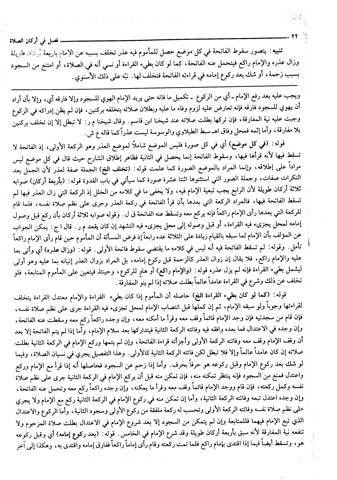 تَنْبِيهٌ: يُتَصَوَّرُ سُقُوطُ الْفَاتِحَةِ فِي كُلِّ مَوْضِعٍ حَصَلَ لِلْمَأْمُومِ فِيهِ عُذْرُ تَخَلَّفَ بِسَبَبِهِ عَنْ الْإِمَامِ بِأَرْبَعَةِ أَرْكَانٍ طَوِيلَةٍ وَزَالَ عُذْرُهُ وَالْإِمَامُ رَاكِعٌ فَيَتَحَمَّلُ عَنْهُ الْفَاتِحَةَ، كَمَا لَوْ كَانَ بَطِيءَ الْقِرَاءَةِ أَوْ نَسِيَ أَنَّهُ فِي الصَّلَاةِ، أَوْ امْتَنَعَ مِنْ السُّجُودِ بِسَبَبِ زَحْمَةٍ، أَوْ شَكَّ بَعْدَ رُكُوعِ إمَامِهِ فِي قِرَاءَتِهِ الْفَاتِحَةَ فَتَخَلَّفَ لَهَا. نَبَّهَ عَلَى ذَلِكَ الْإِسْنَوِيُّ.