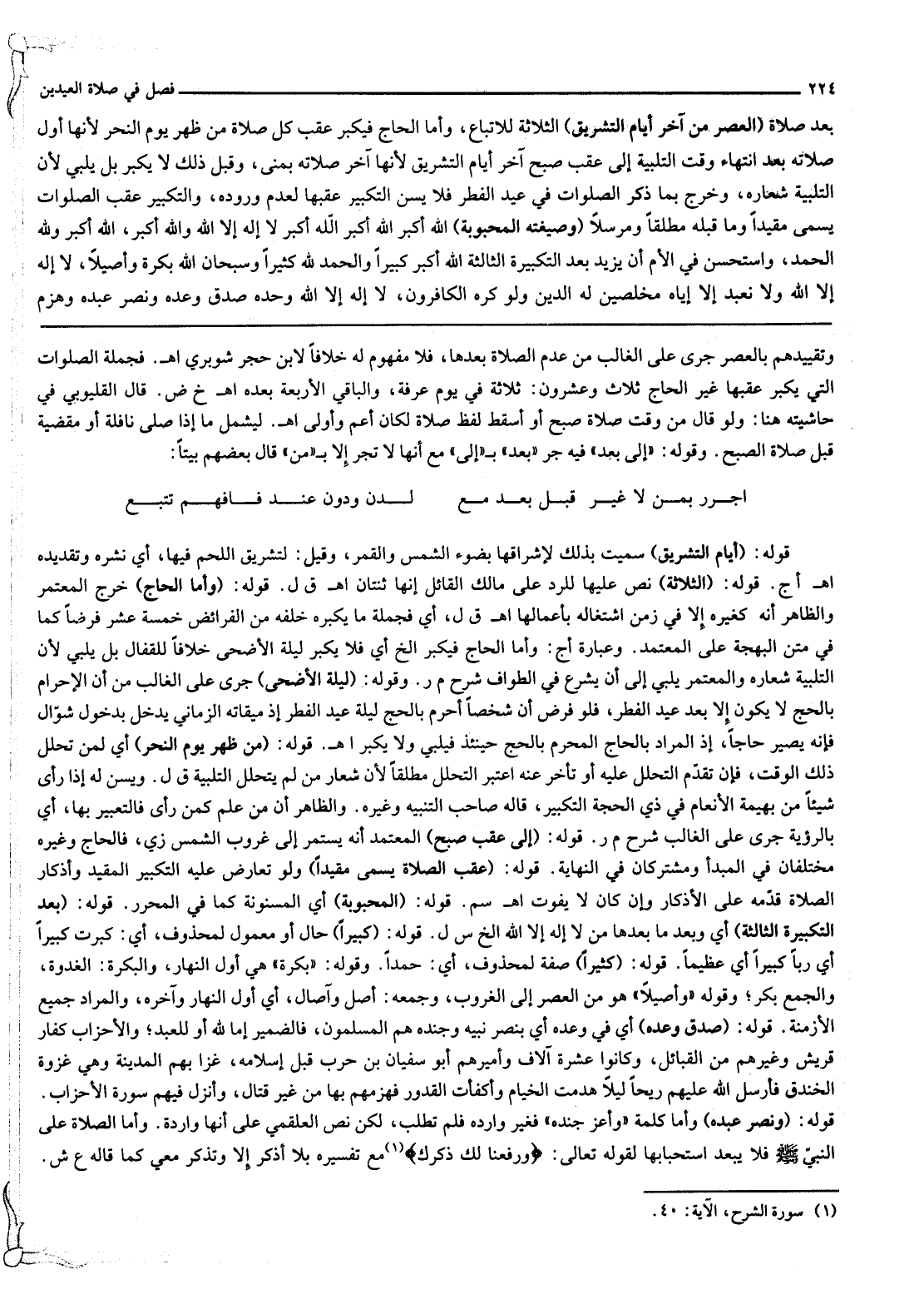 قَوْلُهُ: (إلَى عَقِبِ صُبْحِ) الْمُعْتَمَدُ أَنَّهُ يَسْتَمِرُّ إلَى غُرُوبِ الشَّمْسِ زي، فَالْحَاجُّ وَغَيْرُهُ مُخْتَلِفَانِ فِي الْمَبْدَأِ وَمُشْتَرِكَانِ فِي النِّهَايَةِ. قَوْلُهُ: (عَقِبَ الصَّلَاةِ يُسَمَّى مُقَيَّدًا) وَلَوْ تَعَارَضَ عَلَيْهِ التَّكْبِيرُ الْمُقَيَّدُ وَأَذْكَارُ الصَّلَاةِ قَدَّمَهُ عَلَى الْأَذْكَارِ وَإِنْ كَانَ لَا يَفُوتُ. اهـ. سم.