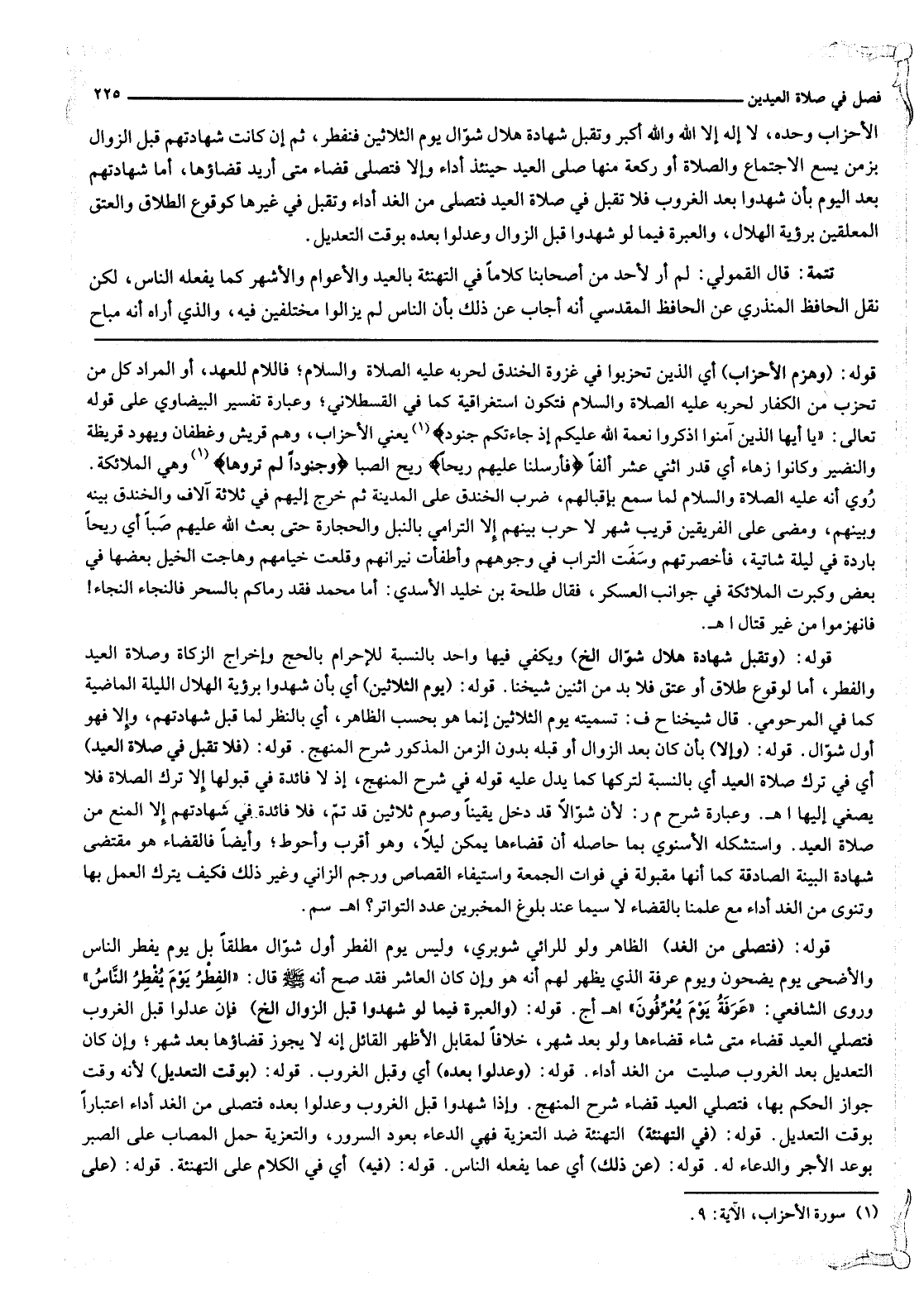الْأَحْزَابَ وَحْدَهُ، لَا إلَهَ إلَّا اللَّهُ وَاَللَّهُ أَكْبَرُ، وَتُقْبَلُ شَهَادَةُ هِلَالِ شَوَّالٍ يَوْمَ الثَّلَاثِينَ فَنُفْطِرُ، ثُمَّ إنْ كَانَتْ شَهَادَتُهُمْ قَبْلَ الزَّوَالِ بِزَمَنٍ يَسَعُ الِاجْتِمَاعَ وَالصَّلَاةَ أَوْ رَكْعَةً مِنْهَا صَلَّى الْعِيدَ حِينَئِذٍ أَدَاءً وَإِلَّا فَتُصَلَّى قَضَاءً مَتَى أُرِيدَ قَضَاؤُهَا، أَمَّا شَهَادَتُهُمْ بَعْدَ الْيَوْمِ بِأَنْ شَهِدُوا بَعْدَ الْغُرُوبِ فَلَا تُقْبَلُ فِي صَلَاةِ الْعِيدِ فَتُصَلَّى مِنْ الْغَدِ أَدَاءً وَتُقْبَلُ فِي غَيْرِهَا كَوُقُوعِ الطَّلَاقِ وَالْعِتْقِ الْمُعَلَّقَيْنِ بِرُؤْيَةِ الْهِلَالِ، وَالْعِبْرَةُ فِيمَا لَوْ شَهِدُوا قَبْلَ الزَّوَالِ وَعُدِّلُوا بَعْدَهُ بِوَقْتِ التَّعْدِيلِ تَتِمَّةٌ: قَالَ الْقَمُولِيُّ: لَمْ أَرَ لِأَحَدٍ مِنْ أَصْحَابِنَا كَلَامًا فِي التَّهْنِئَةِ بِالْعِيدِ وَالْأَعْوَامِ وَالْأَشْهُرِ كَمَا يَفْعَلُهُ النَّاسُ، لَكِنْ نَقَلَ الْحَافِظُ الْمُنْذِرِيُّ عَنْ الْحَافِظِ الْمَقْدِسِيِّ أَنَّهُ أَجَابَ عَنْ ذَلِكَ بِأَنَّ النَّاسَ لَمْ يَزَالُوا مُخْتَلِفِينَ فِيهِ، وَاَلَّذِي أَرَاهُ أَنَّهُ مُبَاحٌ