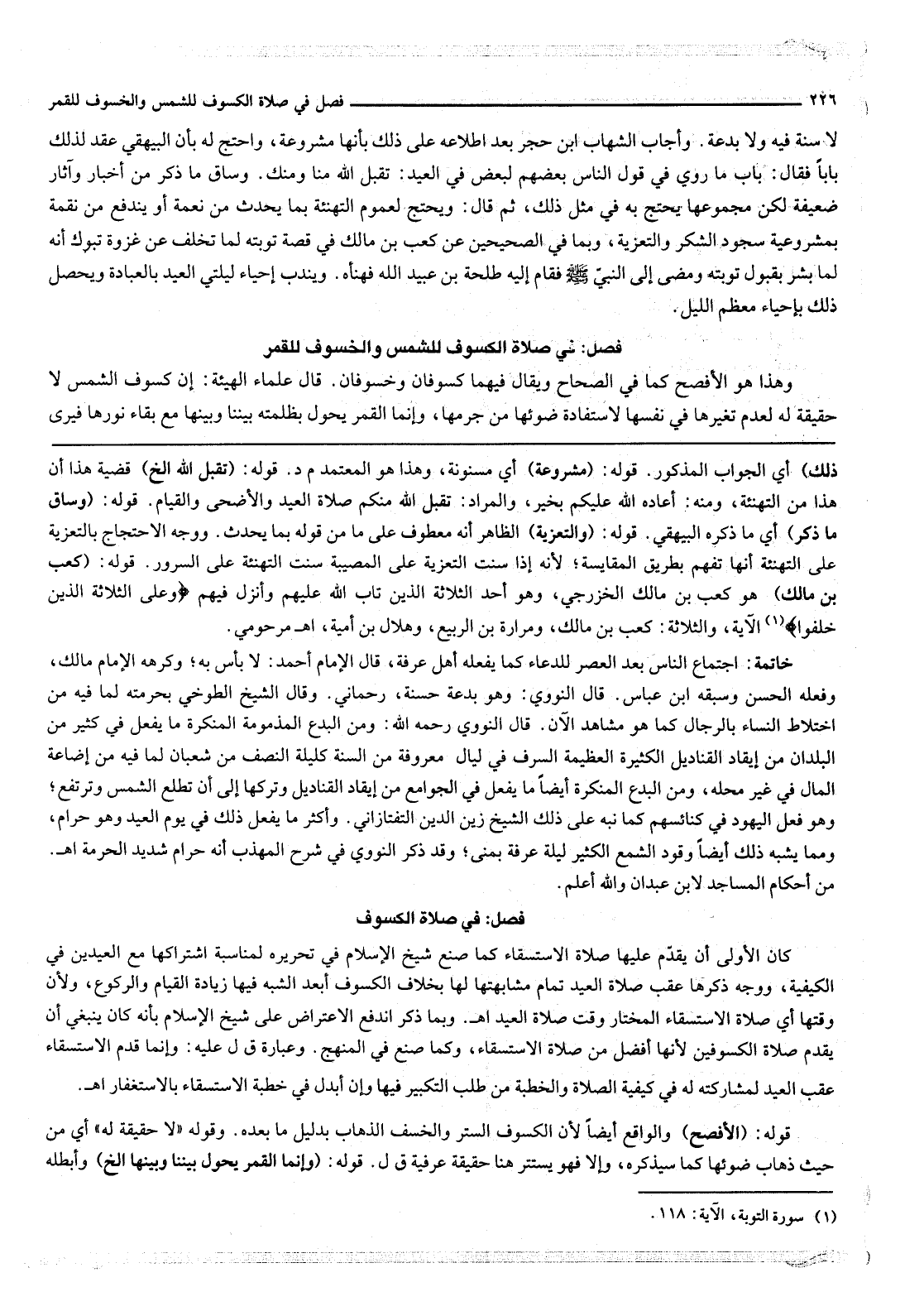 فَصْلٌ: فِي صَلَاةِ الْكُسُوفِ لِلشَّمْسِ وَالْخُسُوفِ لِلْقَمَرِ وَهَذَا هُوَ الْأَفْصَحُ كَمَا فِي الصِّحَاحِ وَيُقَالُ فِيهِمَا كُسُوفَانِ وَخُسُوفَانِ قَالَ عُلَمَاءُ الْهَيْئَةِ: إنَّ كُسُوفَ الشَّمْسِ لَا حَقِيقَةَ لَهُ لِعَدَمِ تَغَيُّرِهَا فِي نَفْسِهَا لِاسْتِفَادَةِ ضَوْئِهَا مِنْ جِرْمِهَا، وَإِنَّمَا الْقَمَرُ يَحُولُ بِظُلْمَتِهِ بَيْنَنَا وَبَيْنَهَا مَعَ بَقَاءِ نُورِهَا فَيُرَى