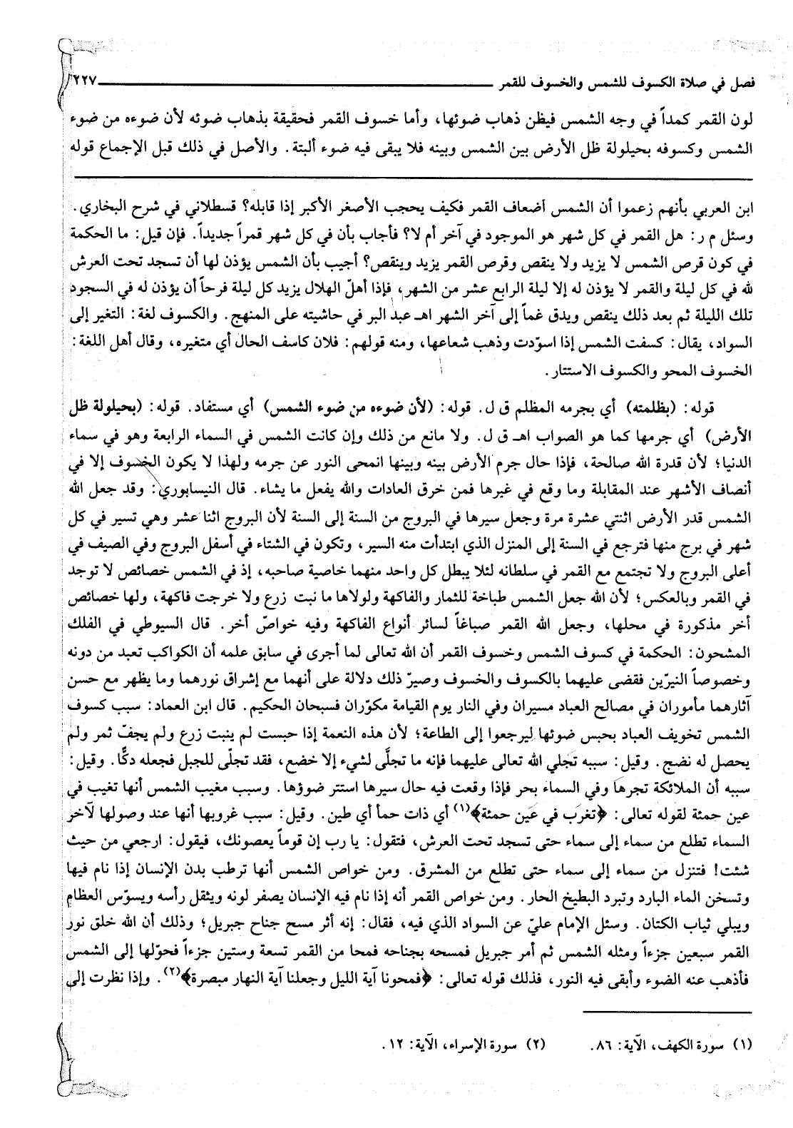 لَوْنُ الْقَمَرِ كَمَدًا فِي وَجْهِ الشَّمْسِ فَيُظَنُّ ذَهَابُ ضَوْئِهَا، وَأَمَّا خُسُوفُ الْقَمَرِ فَحَقِيقَةٌ بِذَهَابِ ضَوْئِهِ لِأَنَّ ضَوْءَهُ مِنْ ضَوْءِ الشَّمْسِ وَكُسُوفَهُ بِحَيْلُولَةِ ظِلِّ الْأَرْضِ بَيْنَ الشَّمْسِ وَبَيْنَهُ فَلَا يَبْقَى فِيهِ ضَوْءٌ أَلْبَتَّةَ وَالْأَصْلُ فِي ذَلِكَ قَبْلَ الْإِجْمَاعِ