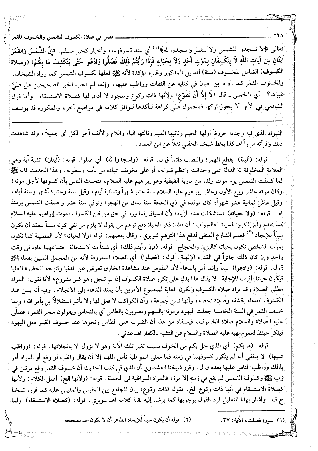قَوْلُهُ: {وَاسْجُدُوا لِلَّهِ} [فصلت: 37] أَيْ صَلُّوا. قَوْلُهُ: (آيَتَانِ) تَثْنِيَةُ آيَةٍ وَهِيَ الْعَلَامَةُ الْمَخْلُوقَةُ لِلَّهِ الدَّالَّةُ عَلَى وَحْدَانِيِّتِهِ وَعِظَمِ قُدْرَتِهِ، أَوْ عَلَى تَخْوِيفِ عِبَادِهِ مِنْ بَأْسِهِ وَسَطْوَتِهِ. وَهَذَا الْحَدِيثُ قَالَهُ - صَلَّى اللَّهُ عَلَيْهِ وَسَلَّمَ - لَمَّا كَسَفَتْ الشَّمْسُ يَوْمَ مَوْتِ وَلَدِهِ مِنْ مَارِيَةِ الْقِبْطِيَّةِ وَهُوَ إبْرَاهِيمُ - عَلَيْهِ السَّلَامُ -، فَتَحَدَّثَ النَّاسُ بِأَنَّ كُسُوفَهَا لِأَجْلِ مَوْتِهِ؛ وَكَانَ مَوْتُهُ عَاشِرَ رَبِيعِ الْأَوَّلِ وَعَاشَ إبْرَاهِيمُ - عَلَيْهِ السَّلَامُ - سِتَّةَ عَشَرَ شَهْرًا وَثَمَانِيَةَ أَيَّامٍ، وَقِيلَ سَنَةً وَعَشَرَةَ أَشْهُرٍ وَسِتَّةَ أَيَّامٍ، وَقِيلَ عَاشَ ثَمَانِيَةَ عَشَرَ شَهْرًا؛ كَانَ مَوْلِدُهُ فِي ذِي الْحِجَّةِ سَنَةَ ثَمَانٍ مِنْ الْهِجْرَةِ وَتُوُفِّيَ سَنَةَ عَشْرٍ وَخَسَفَتْ الشَّمْسُ يَوْمَئِذٍ اهـ.