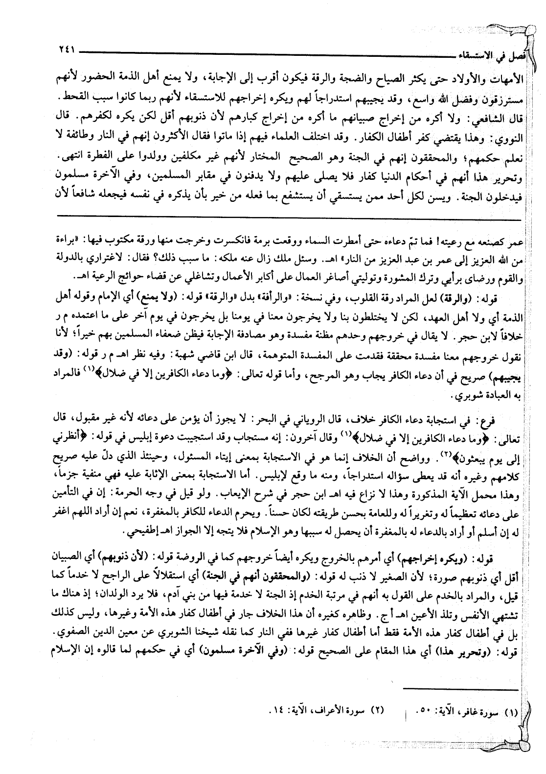 الْأُمَّهَاتِ وَالْأَوْلَادِ حَتَّى يَكْثُرَ الصِّيَاحُ وَالضَّجَّةُ وَالرِّقَّةُ فَيَكُونُ أَقْرَبَ إلَى الْإِجَابَةِ، وَلَا يُمْنَعُ أَهْلُ الذِّمَّةِ الْحُضُورَ لِأَنَّهُمْ مُسْتَرْزَقُونَ وَفَضْلُ اللَّهِ وَاسِعٌ، وَقَدْ يُجِيبُهُمْ اسْتِدْرَاجًا لَهُمْ وَيُكْرَهُ إخْرَاجُهُمْ لِلِاسْتِسْقَاءِ لِأَنَّهُمْ رُبَّمَا كَانُوا سَبَبَ الْقَحْطِ قَالَ الشَّافِعِيُّ: وَلَا أَكْرَهُ مِنْ إخْرَاجِ صِبْيَانِهِمْ مَا أَكْرَهُ مِنْ إخْرَاجِ كِبَارِهِمْ لِأَنَّ ذُنُوبَهُمْ أَقَلُّ لَكِنْ يُكْرَهُ لِكُفْرِهِمْ قَالَ النَّوَوِيُّ: وَهَذَا يَقْتَضِي كُفْرَ أَطْفَالِ الْكُفَّارِ وَقَدْ اخْتَلَفَ الْعُلَمَاءُ فِيهِمْ إذَا مَاتُوا فَقَالَ الْأَكْثَرُونَ: إنَّهُمْ فِي النَّارِ وَطَائِفَةٌ لَا نَعْلَمُ حُكْمَهُمْ؛ وَالْمُحَقِّقُونَ إنَّهُمْ فِي الْجَنَّةِ وَهُوَ الصَّحِيحُ الْمُخْتَارُ لِأَنَّهُمْ غَيْرُ مُكَلَّفِينَ وَوُلِدُوا عَلَى الْفِطْرَةِ انْتَهَى وَتَحْرِيرُ هَذَا أَنَّهُمْ فِي أَحْكَامِ الدُّنْيَا كُفَّارٌ فَلَا يُصَلَّى عَلَيْهِمْ وَلَا يُدْفَنُونَ فِي مَقَابِرِ الْمُسْلِمِينَ، وَفِي الْآخِرَةِ مُسْلِمُونَ فَيَدْخُلُونَ الْجَنَّةَ وَيُسَنُّ لِكُلٍّ أَحَدٍ مِمَّنْ يَسْتَسْقِي أَنْ يَسْتَشْفِعَ بِمَا فَعَلَهُ مِنْ خَيْرٍ بِأَنْ يَذْكُرَهُ فِي نَفْسِهِ فَيَجْعَلَهُ شَافِعًا لِأَنَّ
