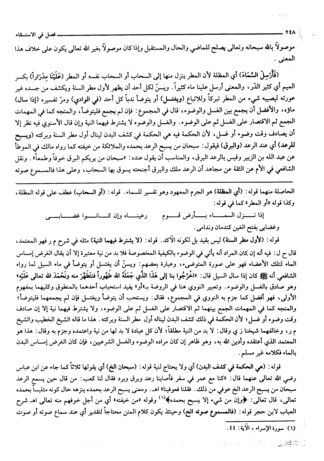 وَيُسَنُّ لِكُلِّ أَحَدٍ أَنْ يَظْهَرَ لِأَوَّلِ مَطَرِ السَّنَةِ وَيَكْشِفَ مِنْ جَسَدِهِ غَيْرَ عَوْرَتِهِ لِيُصِيبَهُ شَيْءٌ مِنْ الْمَطَرِ تَبَرُّكًا وَلِلِاتِّبَاعِ (وَيَغْتَسِلَ) أَوْ يَتَوَضَّأَ نَدْبًا كُلُّ أَحَدٍ (فِي الْوَادِي) وَمَرَّ تَفْسِيرُهُ (إذَا سَالَ) مَاؤُهُ، وَالْأَفْضَلُ أَنْ يَجْمَعَ بَيْنَ الْغُسْلِ وَالْوُضُوءِ، قَالَ فِي الْمَجْمُوعِ: فَإِنْ لَمْ يَجْمَعْ فَلْيَتَوَضَّأْ، وَالْمُتَّجَهُ كَمَا فِي الْمُهِمَّاتِ الْجَمْعُ ثُمَّ الِاقْتِصَارُ عَلَى الْغُسْلِ ثُمَّ عَلَى الْوُضُوءِ وَالْغُسْلُ وَالْوُضُوءُ لَا يُشْتَرَطُ فِيهِمَا النِّيَّةُ وَإِنْ قَالَ الْإِسْنَوِيُّ: فِيهِ نَظَرٌ إلَّا أَنْ يُصَادِفَ وَقْتَ وُضُوءٍ أَوْ غُسْلٍ، لِأَنَّ الْحِكْمَةَ فِيهِ هِيَ الْحِكْمَةُ فِي كَشْفِ الْبَدَنِ لِيَنَالَ أَوَّلَ مَطَرِ السَّنَةِ وَبَرَكَتَهُ (وَيُسَبِّحَ لِلرَّعْدِ) أَيْ عِنْدَ الرَّعْدِ (وَالْبَرْقِ) فَيَقُولَ: «سُبْحَانَ مَنْ يُسَبِّحُ الرَّعْدُ بِحَمْدِهِ وَالْمَلَائِكَةُ مِنْ خِيفَتِهِ» كَمَا رَوَاهُ مَالِكٌ فِي الْمُوَطَّأِ عَنْ عَبْدِ اللَّهِ بْنِ الزُّبَيْرِ وَقِيسَ بِالرَّعْدِ الْبَرْقُ، وَالْمُنَاسِبُ أَنْ يَقُولَ عِنْدَهُ: " سُبْحَانَ مَنْ يُرِيكُمْ الْبَرْقَ خَوْفًا وَطَمَعًا " وَنَقَلَ الشَّافِعِيُّ فِي الْأُمِّ عَنْ الثِّقَةِ عَنْ مُجَاهِدٍ أَنَّ الرَّعْدَ مَلَكٌ وَالْبَرْقَ أَجْنِحَتُهُ يَسُوقُ بِهَا السَّحَابَ، وَعَلَى هَذَا فَالْمَسْمُوعُ صَوْتُهُ