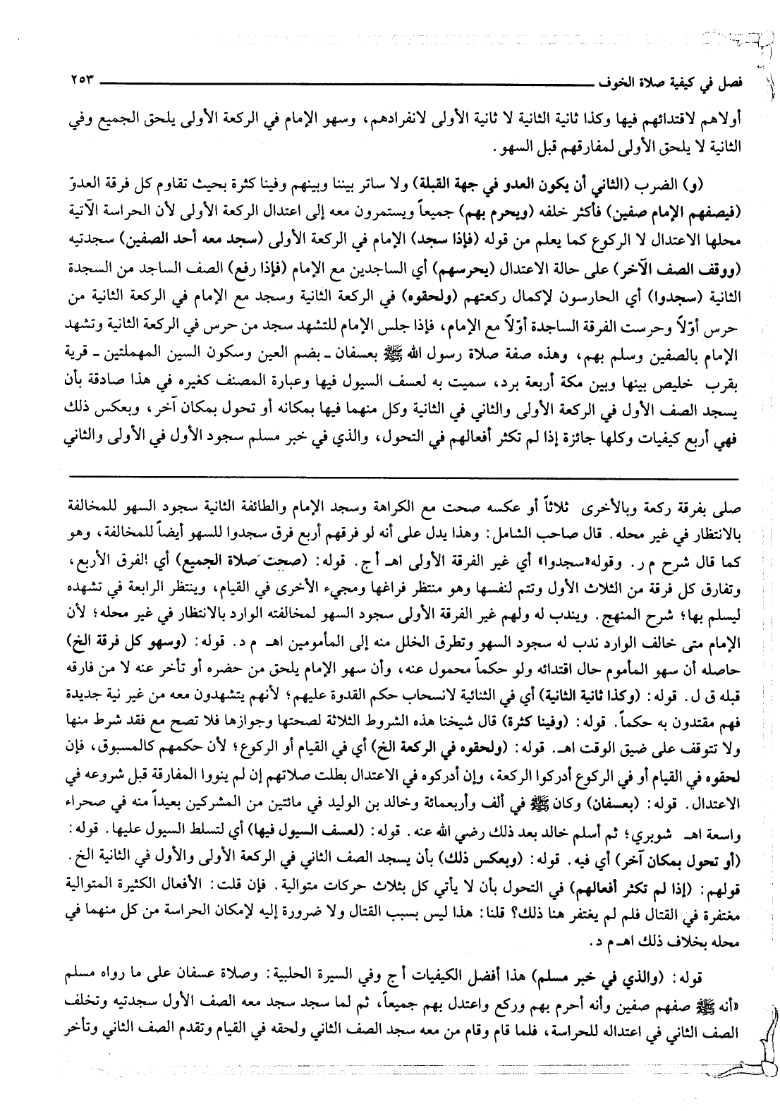 قَوْلُهُ: (وَاَلَّذِي فِي خَبَرِ مُسْلِمٍ) هَذَا أَفْضَلُ الْكَيْفِيَّاتِ أج وَفِي السِّيرَةِ الْحَلَبِيَّةِ: وَصَلَاةُ عُسْفَانَ عَلَى مَا رَوَاهُ مُسْلِمٌ «أَنَّهُ - صَلَّى اللَّهُ عَلَيْهِ وَسَلَّمَ - صَفَّهُمْ صَفَّيْنِ وَأَنَّهُ أَحْرَمَ بِهِمْ وَرَكَعَ وَاعْتَدَلَ بِهِمْ جَمِيعًا، ثُمَّ لَمَّا سَجَدَ سَجَدَ مَعَهُ الصَّفُّ الْأَوَّلُ سَجْدَتَيْهِ وَتَخَلَّفَ الصَّفُّ الثَّانِي فِي اعْتِدَالِهِ لِلْحِرَاسَةِ، فَلَمَّا قَامَ وَقَامَ مَنْ مَعَهُ سَجَدَ الصَّفُّ الثَّانِي وَلَحِقَهُ فِي الْقِيَامِ وَتَقَدَّمَ الصَّفُّ الثَّانِي وَتَأَخَّرَ