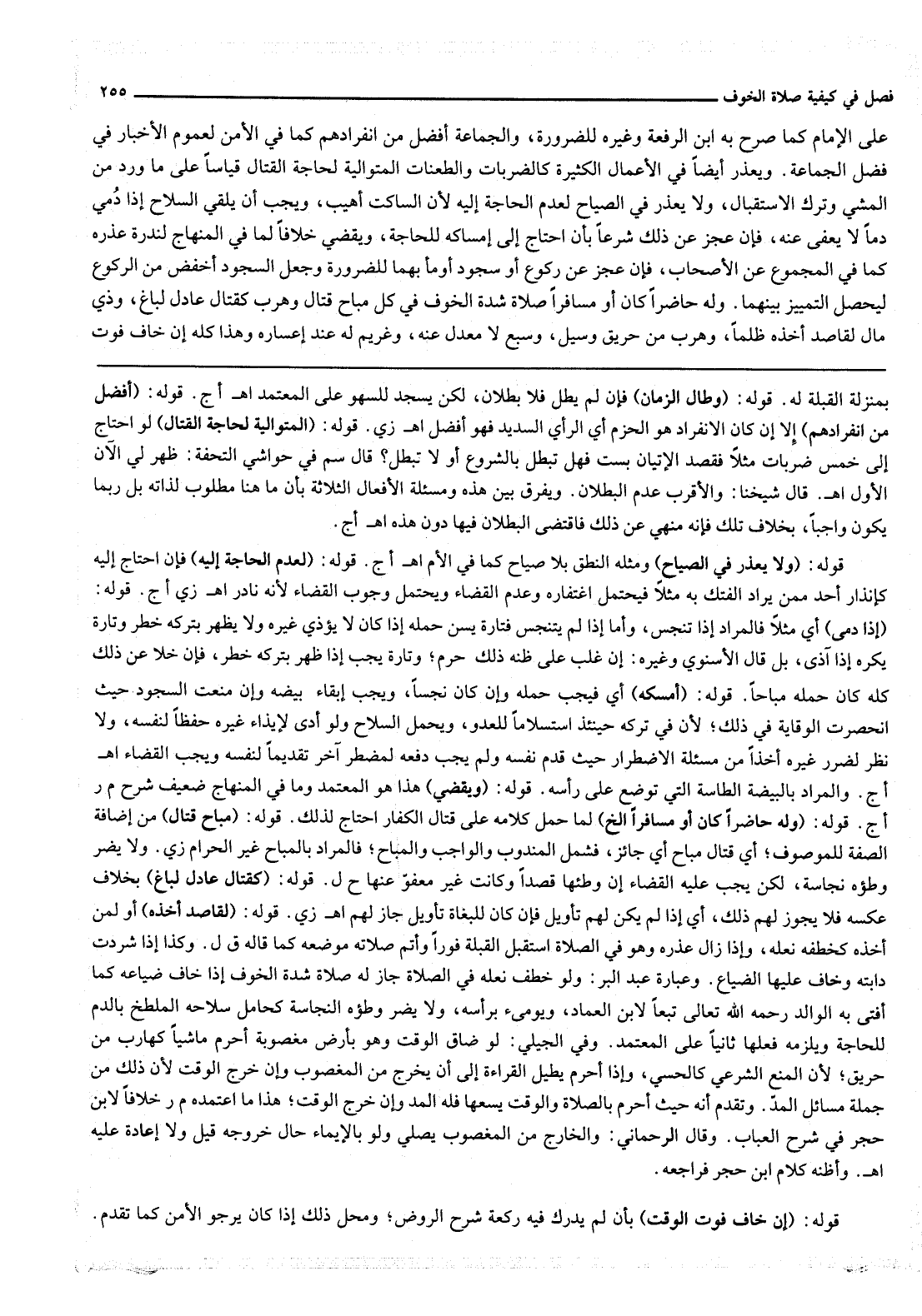 عَلَى الْإِمَامِ كَمَا صَرَّحَ بِهِ ابْنُ الرِّفْعَةِ وَغَيْرُهُ لِلضَّرُورَةِ، وَالْجَمَاعَةُ أَفْضَلُ مِنْ انْفِرَادِهِمْ كَمَا فِي الْأَمْنِ لِعُمُومِ الْأَخْبَارِ فِي فَضْلِ الْجَمَاعَةِ. وَيُعْذَرُ أَيْضًا فِي الْأَعْمَالِ الْكَثِيرَةِ كَالضَّرَبَاتِ وَالطَّعَنَاتِ الْمُتَوَالِيَةِ لِحَاجَةِ الْقِتَالِ قِيَاسًا عَلَى مَا وَرَدَ مِنْ الْمَشْيِ وِتْرِك الِاسْتِقْبَالِ، وَلَا يُعْذَرُ فِي الصِّيَاحِ لِعَدَمِ الْحَاجَةِ إلَيْهِ لِأَنَّ السَّاكِتَ أَهْيَبُ، وَيَجِبُ أَنْ يُلْقِيَ السِّلَاحَ إذَا دَمِي دَمًا لَا يُعْفَى عَنْهُ، فَإِنْ عَجَزَ عَنْ ذَلِكَ شَرْعًا بِأَنْ احْتَاجَ إلَى إمْسَاكِهِ لِلْحَاجَةِ، وَيَقْضِي خِلَافًا لِمَا فِي الْمِنْهَاجِ لِنُدْرَةِ عُذْرِهِ كَمَا فِي الْمَجْمُوعِ عَنْ الْأَصْحَابِ، فَإِنْ عَجْزَ عَنْ رُكُوعٍ أَوْ سُجُودٍ أَوْمَأَ بِهِمَا لِلضَّرُورَةِ وَجَعَلَ السُّجُودَ أَخْفَضَ مِنْ الرُّكُوعِ لِيَحْصُلَ التَّمْيِيزُ بَيْنَهُمَا. وَلَهُ حَاضِرًا كَانَ أَوْ مُسَافِرًا صَلَاةُ شِدَّةِ الْخَوْفِ فِي كُلِّ مُبَاحِ قِتَالٍ وَهَرَبٍ كَقِتَالٍ عَادِلٍ لِبَاغٍ، وَذِي مَالٍ لِقَاصِدٍ أَخَذَهُ ظُلْمًا، وَهَرَبٍ مِنْ حَرِيقٍ وَسَيْلٍ، وَسَبُعٍ لَا مَعْدِلَ عَنْهُ، وَغَرِيمٍ لَهُ عِنْدَ إعْسَارِهِ وَهَذَا كُلُّهُ إنْ خَافَ فَوْتَ