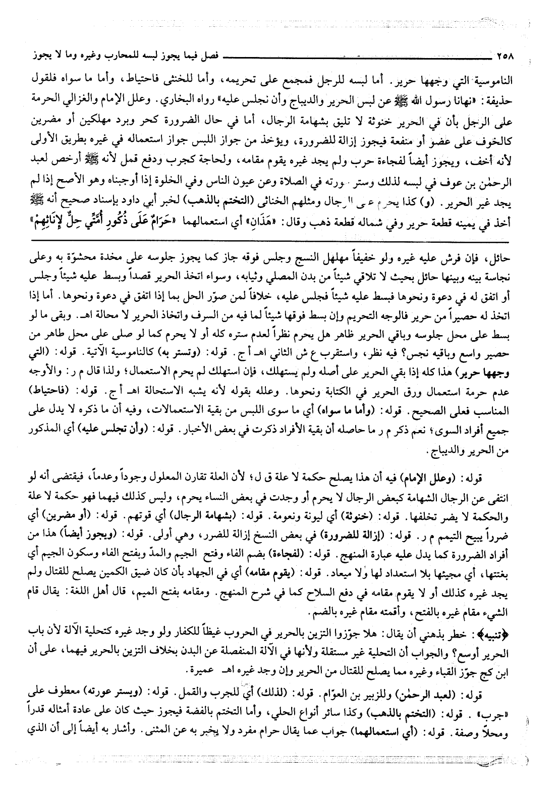 النَّامُوسِيَّةِ الَّتِي وَجْهُهَا حَرِيرٌ. أَمَّا لُبْسُهُ لِلرَّجُلِ فَمُجْمَعٌ عَلَى تَحْرِيمِهِ، وَأَمَّا لِلْخُنْثَى فَاحْتِيَاطٌ، وَأَمَّا مَا سِوَاهُ فَلِقَوْلِ حُذَيْفَةَ: «نَهَانَا رَسُولُ اللَّهِ - صَلَّى اللَّهُ عَلَيْهِ وَسَلَّمَ - عَنْ لُبْسِ الْحَرِيرِ وَالدِّيبَاجِ وَأَنْ نَجْلِسَ عَلَيْهِ» رَوَاهُ الْبُخَارِيُّ. وَعَلَّلَ الْإِمَامُ وَالْغَزَالِيُّ الْحُرْمَةَ عَلَى الرَّجُلِ بِأَنَّ فِي الْحَرِيرِ خُنُوثَةٌ لَا تَلِيقُ بِشَهَامَةِ الرِّجَالِ، أَمَّا فِي حَالِ الضَّرُورَةِ كَحَرٍّ وَبَرْدٍ مُهْلِكَيْنِ أَوْ مُضِرَّيْنِ كَالْخَوْفِ عَلَى عُضْوٍ أَوْ مَنْفَعَةٍ فَيَجُوزُ إزَالَةً