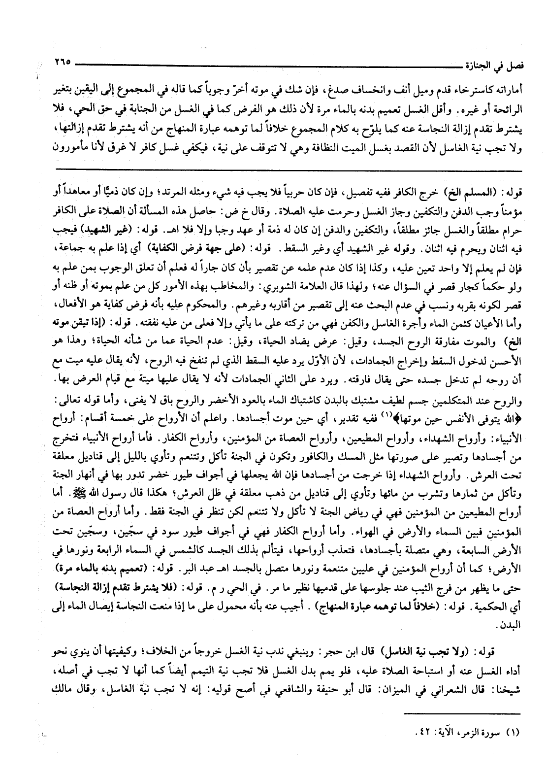 قَوْلُهُ تَعَالَى: {اللَّهُ يَتَوَفَّى الأَنْفُسَ حِينَ مَوْتِهَا} [الزمر: 42] فَفِيهِ تَقْدِيرٌ، أَيْ حِينَ مَوْتِ أَجْسَادِهَا وَاعْلَمْ أَنَّ الْأَرْوَاحَ عَلَى خَمْسَةِ أَقْسَامٍ: أَرْوَاحُ الْأَنْبِيَاءِ: وَأَرْوَاحُ الشُّهَدَاءِ، وَأَرْوَاحُ الْمُطِيعِينَ، وَأَرْوَاحُ الْعُصَاةِ مِنْ الْمُؤْمِنِينَ، وَأَرْوَاحُ الْكُفَّارِ فَأَمَّا أَرْوَاحُ الْأَنْبِيَاءِ فَتَخْرُجُ مِنْ أَجْسَادِهَا وَتَصِيرُ عَلَى صُورَتِهَا مِثْلَ الْمِسْكِ وَالْكَافُورِ وَتَكُونُ فِي الْجَنَّةِ تَأْكُلُ وَتَتَنَعَّمُ وَتَأْوِي بِاللَّيْلِ إلَى قَنَادِيلَ مُعَلَّقَةٍ تَحْتَ الْعَرْشِ وَأَرْوَاحُ الشُّهَدَاءِ إذَا خَرَجَتْ مِنْ أَجْسَادِهَا فَإِنَّ اللَّهَ يَجْعَلُهَا فِي أَجْوَافِ طُيُورٍ خُضْرٍ تَدُورُ بِهَا فِي أَنْهَارِ الْجَنَّةِ وَتَأْكُلُ مِنْ ثِمَارِهَا وَتَشْرَبُ مِنْ مَائِهَا وَتَأْوِي إلَى قَنَادِيلَ مِنْ ذَهَبٍ مُعَلَّقَةٍ فِي ظِلِّ الْعَرْشِ؛ هَكَذَا قَالَ رَسُولُ اللَّهِ - صَلَّى اللَّهُ عَلَيْهِ وَسَلَّمَ - أَمَّا أَرْوَاحُ الْمُطِيعِينَ مِنْ الْمُؤْمِنِينَ فَهِيَ فِي رِيَاضِ الْجَنَّةِ لَا تَأْكُلُ وَلَا تَتَنَعَّمُ لَكِنْ تَنْظُرُ فِي الْجَنَّةِ فَقَطْ وَأَمَّا أَرْوَاحُ الْعُصَاةِ مِنْ الْمُؤْمِنِينَ فَبَيْنَ السَّمَاءِ وَالْأَرْضِ فِي الْهَوَاءِ وَأَمَّا أَرْوَاحُ الْكُفَّارِ فَهِيَ فِي أَجْوَافِ طُيُورٍ سُودٍ فِي سِجِّينٍ، وَسِجِّينٌ تَحْتُ الْأَرْضِ السَّابِعَةِ، وَهِيَ مُتَّصِلَةٌ بِأَجْسَادِهَا، فَتُعَذَّبُ أَرْوَاحُهَا، فَيَتَأَلَّمُ بِذَلِكَ الْجَسَدُ كَالشَّمْسِ فِي السَّمَاءِ الرَّابِعَةِ وَنُورُهَا فِي الْأَرْضِ؛ كَمَا أَنَّ أَرْوَاحَ الْمُؤْمِنِينَ فِي عِلِّيِّينَ مُتَنَعِّمَةٌ وَنُورُهَا مُتَّصِلٌ بِالْجَسَدِ. اهـ. عَبْدُ الْبَرِّ.