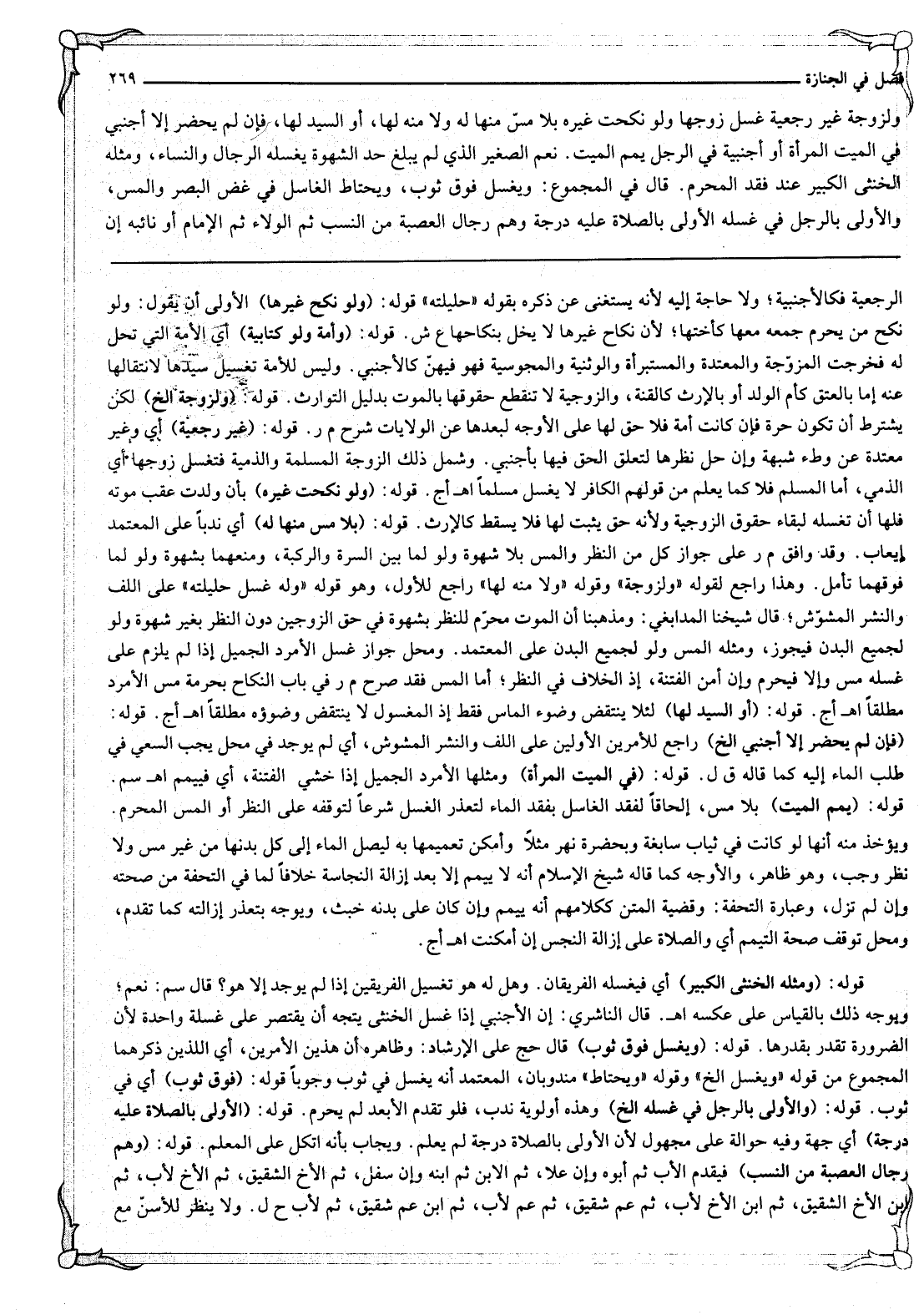 وَلِزَوْجَةٍ غَيْرِ رَجْعِيَّةٍ غُسْلُ زَوْجِهَا وَلَوْ نَكَحَتْ غَيْرَهُ بِلَا مَسٍّ مِنْهَا لَهُ وَلَا مِنْهُ لَهَا، أَوْ السَّيِّدِ لَهَا، فَإِنْ لَمْ يَحْضُرْ إلَّا أَجْنَبِيٌّ فِي الْمَيِّتِ الْمَرْأَةِ أَوْ أَجْنَبِيَّةٌ فِي الرَّجُلِ يُمِّمَ الْمَيِّتُ. نَعَمْ الصَّغِيرُ الَّذِي لَمْ يَبْلُغْ حَدَّ الشَّهْوَةِ يُغَسِّلُهُ الرِّجَالُ وَالنِّسَاءُ، وَمِثْلُهُ الْخُنْثَى الْكَبِيرُ عِنْدَ فَقْدِ الْمَحْرَمِ. قَالَ فِي الْمَجْمُوعِ: وَيُغْسَلُ فَوْقَ ثَوْبِ، وَيَحْتَاطُ الْغَاسِلُ فِي غَضِّ الْبَصَرِ وَالْمَسِّ، وَالَأَوْلَى بِالرَّجُلِ فِي غُسْلِهِ الْأَوْلَى بِالصَّلَاةِ عَلَيْهِ دَرَجَةً وَهُمْ رِجَالُ الْعَصَبَةِ مِنْ النَّسَبِ ثُمَّ الْوَلَاءِ ثُمَّ الْإِمَامُ أَوْ نَائِبُهُ إنْ