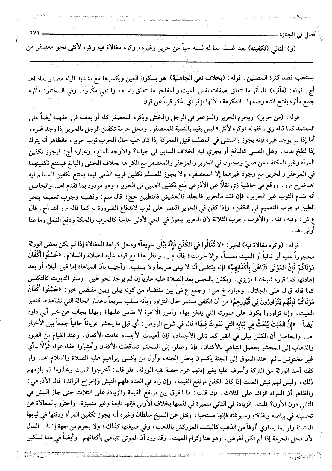 قَوْلُهُ: (وَكُرِهَ مُغَالَاةٌ فِيهِ) لِخَبَرِ: «لَا تُغَالُوا فِي الْكَفَنِ فَإِنَّهُ يَبْلَى سَرِيعًا» وَمَحِلُّ كَرَاهَةِ الْمُغَالَاةِ إذَا لَمْ يَكُنْ بَعْضُ الْوَرَثَةِ مَحْجُورًا عَلَيْهِ أَوْ غَائِبًا أَوْ الْمَيِّتُ مُفْلِسًا، وَإِلَّا حُرِّمَتْ؛ قَالَهُ م ر وَانْظُرْ هَذَا مَعَ قَوْلِهِ - عَلَيْهِ الصَّلَاةُ وَالسَّلَامُ -: «حَسِّنُوا أَكْفَانَ مَوْتَاكُمْ فَإِنَّ الْمَوْتَى تَتَبَاهَى بِأَكْفَانِهِمْ» فَإِنَّهُ يَقْتَضِي أَنَّهُ لَا يَبْلَى سَرِيعًا وَلَا يُسْلَبُ وَأُجِيبُ بِأَنَّ الْمُبَاهَاةَ إمَّا قَبْلَ الْبَلَاءِ أَوْ بَعْدَ إعَادَتِهَا كَمَا قَرَّرَهُ شَيْخُنَا الْعَزِيزِيُّ وَيُكَفَّنُ بِالنَّجِسِ بَعْدَ الصَّلَاةِ عَلَيْهِ عَارِيًّا إنْ لَمْ يُوجَدْ نَحْوُ طِينٍ وَسَتْرُ التَّابُوتِ كَالتَّكْفِينِ كَمَا قَالَهُ ق ل عَلَى الْجَلَالِ، وَعِبَارَةُ خ ض: وَجَمَعَ ع ش بَيْنَ مُقْتَضَاهُ مِنْ كَوْنِهِ يَبْلَى وَبَيْنَ مُقْتَضَى خَبَرِ: «حَسِّنُوا أَكْفَانَ مَوْتَاكُمْ فَإِنَّهُمْ يَتَزَاوَرُونَ فِي قُبُورِهِمْ» مِنْ أَنَّ الْكَفَنَ يَسْتَمِرُّ حَالَ التَّزَاوُرِ وَبِأَنَّهُ يُسْلَبُ سَرِيعًا بِاعْتِبَارِ الْحَالَةِ الَّتِي نُشَاهِدُهَا كَتَغَيُّرِ الْمَيِّتِ، وَإِذَا تَزَاوَرُوا يَكُونُ عَلَى صُورَتِهِ الَّتِي يُدْفَنُ بِهَا، وَأُمُورُ الْآخِرَةِ لَا يُقَاسُ عَلَيْهَا؛ وَبِهَذَا يُجَابُ عَنْ خَبَرِ أَبِي دَاوُد أَيْضًا: «إنَّ الْمَيِّتَ يُبْعَثُ فِي ثِيَابِهِ الَّتِي يَمُوتُ فِيهَا» قَالَ فِي شَرْحِ الرَّوْضِ: أَيْ قَبْلَ مَا يُحْشَرُ عُرْيَانًا حَافِيًا جَمْعًا بَيْنَ الْأَخْبَارِ اهـ.