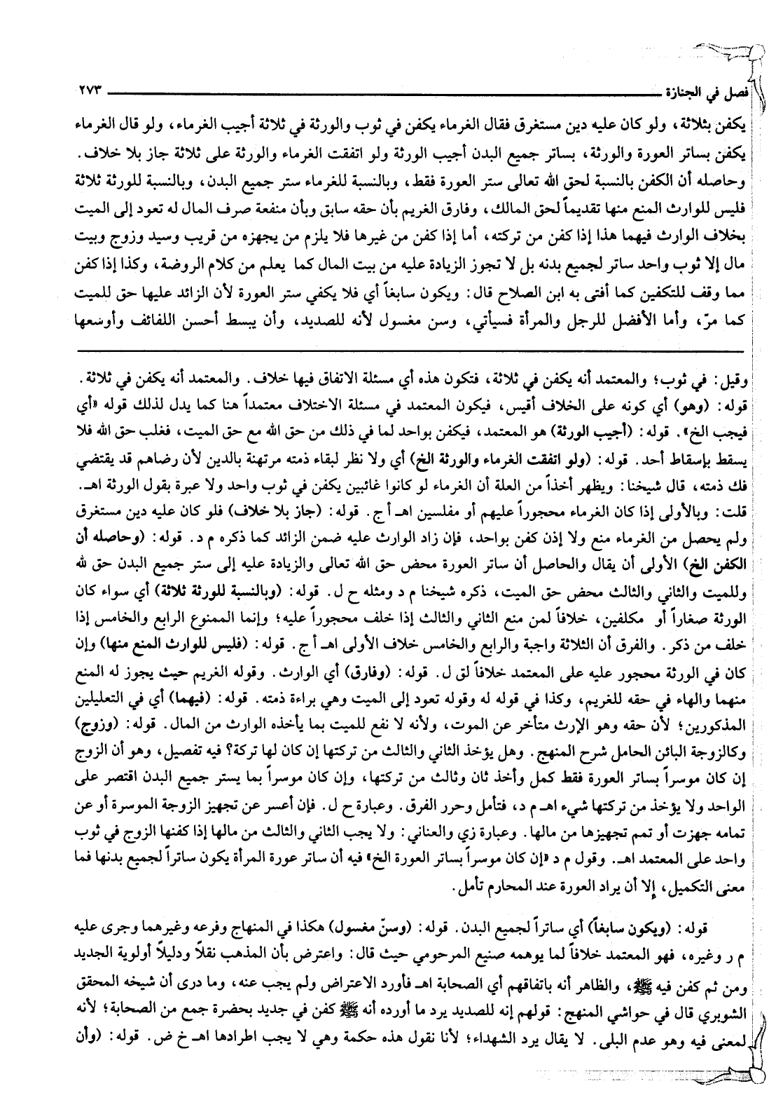 يُكَفَّنَ بِثَلَاثَةٍ، وَلَوْ كَانَ عَلَيْهِ دَيْنٌ مُسْتَغْرِقٌ فَقَالَ الْغُرَمَاءُ: يُكَفَّنُ فِي ثَوْبٍ وَالْوَرَثَةُ فِي ثَلَاثَةٍ أُجِيبَ الْغُرَمَاءُ، وَلَوْ قَالَ الْغُرَمَاءُ: يُكَفَّنُ بِسَاتِرِ الْعَوْرَةِ وَالْوَرَثَةُ، بِسَاتِرِ جَمِيعِ الْبَدَنِ أُجِيبَ الْوَرَثَةُ وَلَوْ اتَّفَقَتْ الْغُرَمَاءُ وَالْوَرَثَةُ عَلَى ثَلَاثَةٍ جَازَ بِلَا خِلَافٍ وَحَاصِلُهُ أَنَّ الْكَفَنَ بِالنِّسْبَةِ لِحَقِّ اللَّهِ تَعَالَى سَتْرُ الْعَوْرَةِ فَقَطْ، وَبِالنِّسْبَةِ لِلْغُرَمَاءِ سَتْرُ جَمِيعِ الْبَدَنِ، وَبِالنِّسْبَةِ لِلْوَرَثَةِ ثَلَاثَةٌ فَلَيْسَ لِلْوَارِثِ الْمَنْعُ مِنْهَا تَقْدِيمًا لِحَقِّ الْمَالِكِ، وَفَارَقَ الْغَرِيمُ بِأَنَّ حَقَّهُ سَابِقٌ وَبِأَنَّ مَنْفَعَةَ صَرْفِ الْمَالِ لَهُ تَعُودُ إلَى الْمَيِّتِ بِخِلَافِ الْوَارِثِ فِيهِمَا هَذَا إذَا كُفِّنَ مِنْ تَرِكَتِهِ، أَمَّا إذَا كُفِّنَ مِنْ غَيْرِهَا فَلَا يَلْزَمُ مَنْ يُجَهِّزُهُ مِنْ قَرِيبٍ وَسَيِّدٍ وَزَوْجٍ وَبَيْتِ مَالٍ إلَّا ثَوْبٌ وَاحِدٌ سَاتِرٌ لِجَمِيعِ بَدَنِهِ بَلْ لَا تَجُوزُ الزِّيَادَةُ عَلَيْهِ مِنْ بَيْتِ الْمَالِ كَمَا يُعْلَمُ مِنْ كَلَامِ الرَّوْضَةِ، وَكَذَا إذَا كُفِّنَ مِمَّا وُقِفَ لِلتَّكْفِينِ كَمَا أَفْتَى بِهِ ابْنُ الصَّلَاحِ قَالَ: وَيَكُونُ سَابِغًا أَيْ فَلَا يَكْفِي سَتْرُ الْعَوْرَةِ لِأَنَّ الزَّائِدَ عَلَيْهَا حَقٌّ لِلْمَيِّتِ كَمَا مَرَّ، وَأَمَّا الْأَفْضَلُ لِلرَّجُلِ وَالْمَرْأَةِ فَسَيَأْتِي، وَسُنَّ مَغْسُولٌ لِأَنَّهُ لِلصَّدِيدِ، وَأَنْ يَبْسُطَ أَحْسَنَ اللَّفَائِفِ وَأَوْسَعَهَا