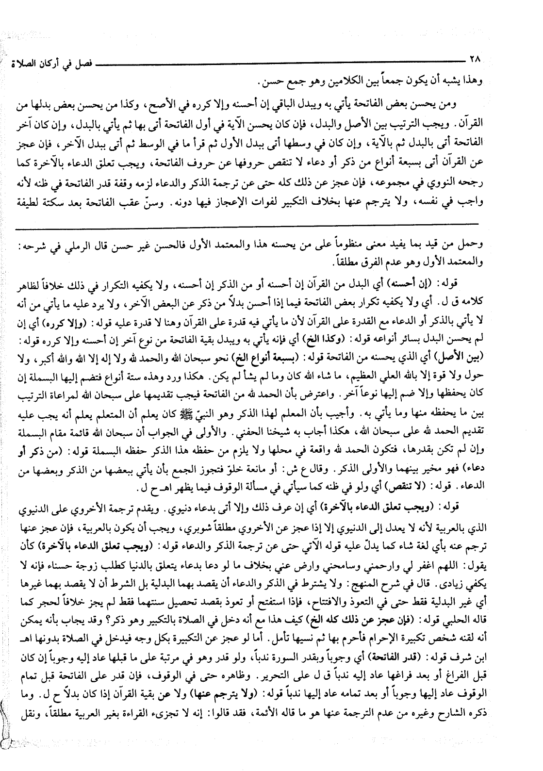 وَمَنْ يُحْسِنُ بَعْضَ الْفَاتِحَةِ يَأْتِي بِهِ وَيُبَدِّلُ الْبَاقِيَ إنْ أَحْسَنَهُ وَإِلَّا كَرَّرَهُ فِي الْأَصَحِّ، وَكَذَا مَنْ يُحْسِنُ بَعْضَ بَدَلِهَا مِنْ الْقُرْآنِ. وَيَجِبُ التَّرْتِيبُ بَيْنَ الْأَصْلِ وَالْبَدَلِ، فَإِنْ كَانَ يُحْسِنُ الْآيَةَ فِي أَوَّلِ الْفَاتِحَةِ أَتَى بِهَا ثُمَّ يَأْتِي بِالْبَدَلِ، وَإِنْ كَانَ آخِرَ الْفَاتِحَةِ أَتَى بِالْبَدَلِ ثُمَّ بِالْآيَةِ، وَإِنْ كَانَ فِي وَسَطِهَا أَتَى بِبَدَلِ الْأَوَّلِ ثُمَّ قَرَأَ مَا فِي الْوَسَطِ ثُمَّ أَتَى بِبَدَلِ الْآخِرِ، فَإِنْ عَجَزَ عَنْ الْقُرْآنِ لَأَتَى بِسَبْعَةِ أَنْوَاعٍ مِنْ ذِكْرٍ أَوْ دُعَاءٍ لَا تَنْقُصُ حُرُوفُهَا عَنْ حُرُوفِ الْفَاتِحَةِ، وَيَجِبُ تَعَلُّقُ الدُّعَاءِ بِالْآخِرَةِ كَمَا رَجَّحَهُ النَّوَوِيُّ فِي مَجْمُوعِهِ، فَإِنْ عَجَزَ عَنْ ذَلِكَ كُلِّهِ حَتَّى عَنْ تَرْجَمَةِ الذِّكْرِ وَالدُّعَاءِ لَزِمَهُ وَقْفَةٌ قَدْرُ الْفَاتِحَةِ فِي ظَنِّهِ لِأَنَّهُ وَاجِبٌ فِي نَفْسِهِ، وَلَا يُتَرْجِمُ عَنْهَا بِخِلَافِ التَّكْبِيرِ لِفَوَاتِ الْإِعْجَازِ فِيهَا دُونَهُ. وَسُنَّ عَقِبَ الْفَاتِحَةِ بَعْدَ سَكْتَةٍ لَطِيفَةٍ