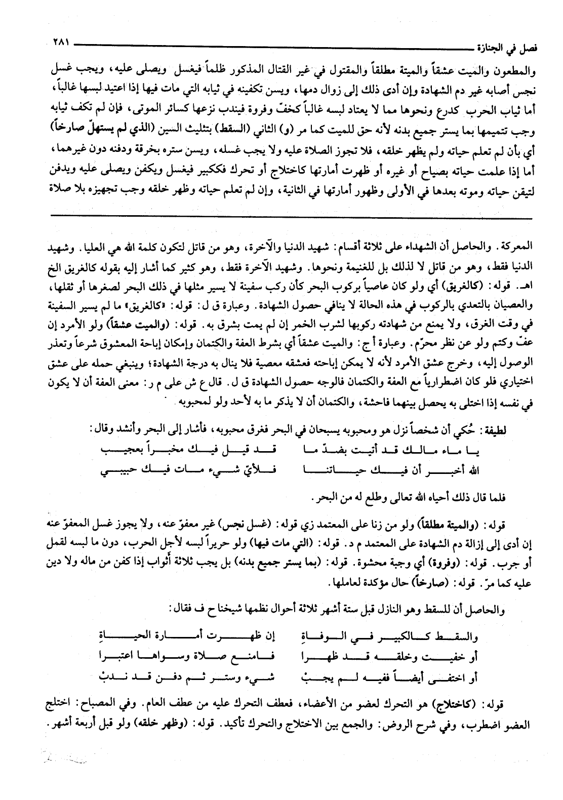 قَوْلُهُ: (وَالْمَيِّتِ عِشْقًا) وَلَوْ الْأَمْرَدَ إنْ عَفَّ وَكَتَمَ وَلَوْ عَنْ نَظَرٍ مُحَرَّمٍ وَعِبَارَةُ أج: وَالْمَيِّتُ عِشْقًا أَيْ بِشَرْطِ الْعِفَّةِ وَالْكِتْمَانِ وَإِمْكَانِ إبَاحَةِ الْمَعْشُوقِ شَرْعًا وَتَعَذُّرِ الْوُصُولِ إلَيْهِ، وَخَرَجَ عِشْقُ الْأَمْرَدِ لِأَنَّهُ لَا يُمْكِنُ إبَاحَتُهُ فَعِشْقُهُ مَعْصِيَةٌ فَلَا يَنَالُ بِهِ دَرَجَةَ الشَّهَادَةِ؛ وَيَنْبَغِي حَمْلُهُ عَلَى عِشْقٍ اخْتِيَارِيٍّ فَلَوْ كَانَ اضْطِرَارِيًّا مَعَ الْعِفَّةِ وَالْكِتْمَانِ فَالْوَجْهُ حُصُولُ الشَّهَادَةِ ق ل قَالَ ع ش عَلَى م ر: مَعْنَى الْعِفَّةِ أَنْ لَا يَكُونَ فِي نَفْسِهِ إذَا اخْتَلَى بِهِ يَحْصُلُ بَيْنَهُمَا فَاحِشَةٌ، وَالْكِتْمَانُ أَنْ لَا يَذْكُرَ مَا بِهِ لِأَحَدٍ وَلَوْ لِمَحْبُوبِهِ، لَطِيفَةٌ: حُكِيَ أَنَّ شَخْصًا نَزَلَ هُوَ وَمَحْبُوبُهُ يَسْبَحَانِ فِي الْبَحْرِ فَغَرِقَ مَحْبُوبُهُ، فَأَشَارَ إلَى الْبَحْرِ وَأَنْشَدَ وَقَالَ: