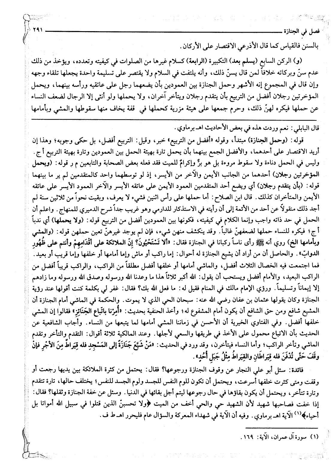 (وَ) الرُّكْنُ السَّابِعُ (يُسَلِّمُ بَعْدَ) التَّكْبِيرَةِ (الرَّابِعَةِ) كَسَلَامِ غَيْرِهَا مِنْ الصَّلَوَاتِ فِي كَيْفِيَّتِهِ وَتَعَدُّدِهِ، وَيُؤْخَذُ مِنْ ذَلِكَ عَدَمُ سَنِّ وَبَرَكَاتِهِ خِلَافًا لِمَنْ قَالَ يُسَنُّ ذَلِكَ، وَأَنَّهُ يَلْتَفِتُ فِي السَّلَامِ وَلَا يَقْتَصِرُ عَلَى تَسْلِيمَةٍ وَاحِدَةٍ يَجْعَلُهَا تِلْقَاءَ وَجْهِهِ وَإِنْ قَالَ فِي الْمَجْمُوعِ إنَّهُ الْأَشْهَرُ وَحَمْلُ الْجِنَازَةِ بَيْنَ الْعَمُودَيْنِ بِأَنْ يَضَعَهُمَا رَجُلٌ عَلَى عَاتِقَيْهِ وَرَأْسُهُ بَيْنَهُمَا، وَيَحْمِلُ الْمُؤَخَّرَتَيْنِ رَجُلَانِ أَفْضَلُ مِنْ التَّرْبِيعِ بِأَنْ يَتَقَدَّمَ رَجُلَانِ وَيَتَأَخَّرَ آخَرَانِ، وَلَا يَحْمِلُهَا وَلَوْ أُنْثَى إلَّا الرِّجَالُ لِضَعْفِ النِّسَاءِ عَنْ حَمْلِهَا فَيُكْرَهُ لَهُنَّ ذَلِكَ، وَحُرِّمَ جَمْعُهَا عَلَى هَيْئَةٍ مُزْرِيَةٍ كَحَمْلِهَا فِي قُفَّةٍ يُخَافُ مِنْهَا سُقُوطُهَا. وَالْمَشْيُ أَمَامَهَا