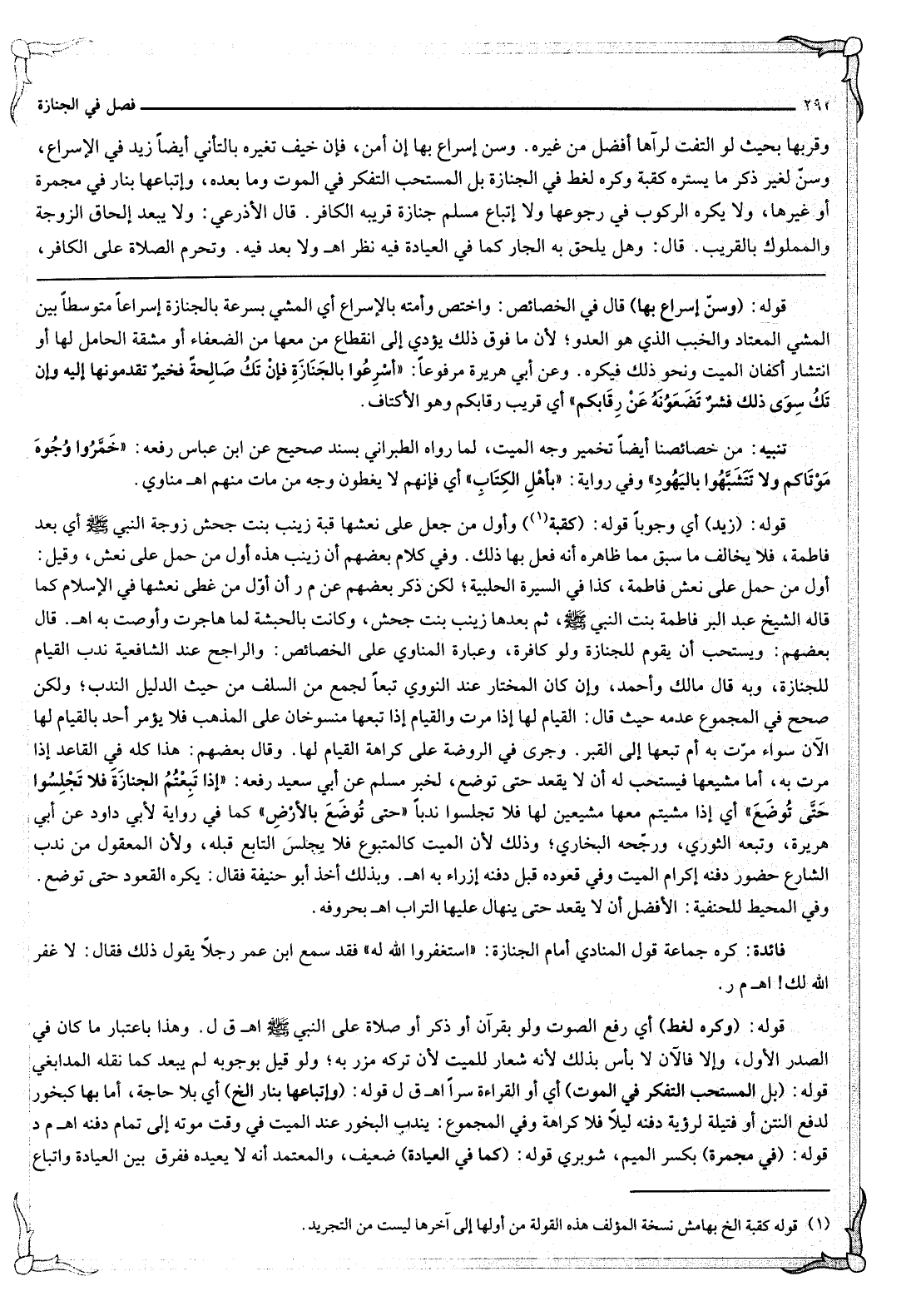 وَقُرْبَهَا بِحَيْثُ لَوْ الْتَفَتَ لَرَآهَا أَفْضَلُ مِنْ غَيْرِهِ. وَسُنَّ إسْرَاعٌ بِهَا إنْ أُمِنَ، فَإِنْ خِيفَ تَغَيُّرُهُ بِالتَّأَنِّي أَيْضًا زَيْدَ فِي الْإِسْرَاعِ، وَسُنَّ لِغَيْرِ ذَكَرٍ مَا يَسْتُرُهُ كَقُبَّةٍ وَكُرِهَ لَغَطٌ فِي الْجِنَازَةِ بَلْ الْمُسْتَحَبُّ التَّفَكُّرُ فِي الْمَوْتِ وَمَا بَعْدَهُ، وَاتِّبَاعُهَا بِنَارٍ فِي مِجْمَرَةٍ أَوْ غَيْرِهَا، وَلَا يُكْرَهُ الرُّكُوبُ فِي رُجُوعِهَا وَلَا اتِّبَاعُ مُسْلِمٍ جِنَازَةَ قَرِيبِهِ الْكَافِرِ. قَالَ الْأَذْرَعِيُّ: وَلَا يُبْعَدُ إلْحَاقُ الزَّوْجَةِ وَالْمَمْلُوكِ بِالْقَرِيبِ. قَالَ: وَهَلْ يَلْحَقُ بِهِ الْجَارُ كَمَا فِي الْعِيَادَةِ فِيهِ نَظَرٌ اهـ وَلَا بُعْدَ فِيهِ. وَتَحْرُمُ الصَّلَاةُ عَلَى الْكَافِرِ،