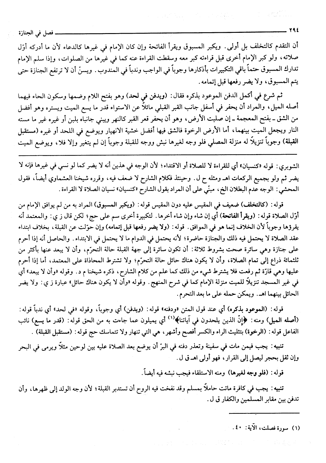 أَنَّ التَّقَدُّمَ كَالتَّخَلُّفِ بَلْ أَوْلَى. وَيُكَبِّرُ الْمَسْبُوقُ وَيَقْرَأُ الْفَاتِحَةَ وَإِنْ كَانَ الْإِمَامُ فِي غَيْرِهَا كَالدُّعَاءِ لِأَنَّ مَا أَدْرَكَهُ أَوَّلَ صَلَاتِهِ، وَلَوْ كَبَّرَ الْإِمَامُ أُخْرَى قَبْلَ قِرَاءَتِهِ كَبَّرَ مَعَهُ وَسَقَطَتْ الْقِرَاءَةُ عَنْهُ كَمَا فِي غَيْرِهَا مِنْ الصَّلَوَاتِ، وَإِذَا سَلَّمَ الْإِمَامُ تَدَارَكَ الْمَسْبُوقُ حَتْمًا بَاقِيَ التَّكْبِيرَاتِ بِأَذْكَارِهَا وُجُوبًا فِي الْوَاجِبِ وَنَدْبًا فِي الْمَنْدُوبِ. وَيُسَنُّ أَنْ لَا تَرْتَفِعَ الْجِنَازَةُ حَتَّى يُتِمَّ الْمَسْبُوقُ، وَلَا يَضُرُّ رَفْعُهَا قَبْلَ إتْمَامِهِ.