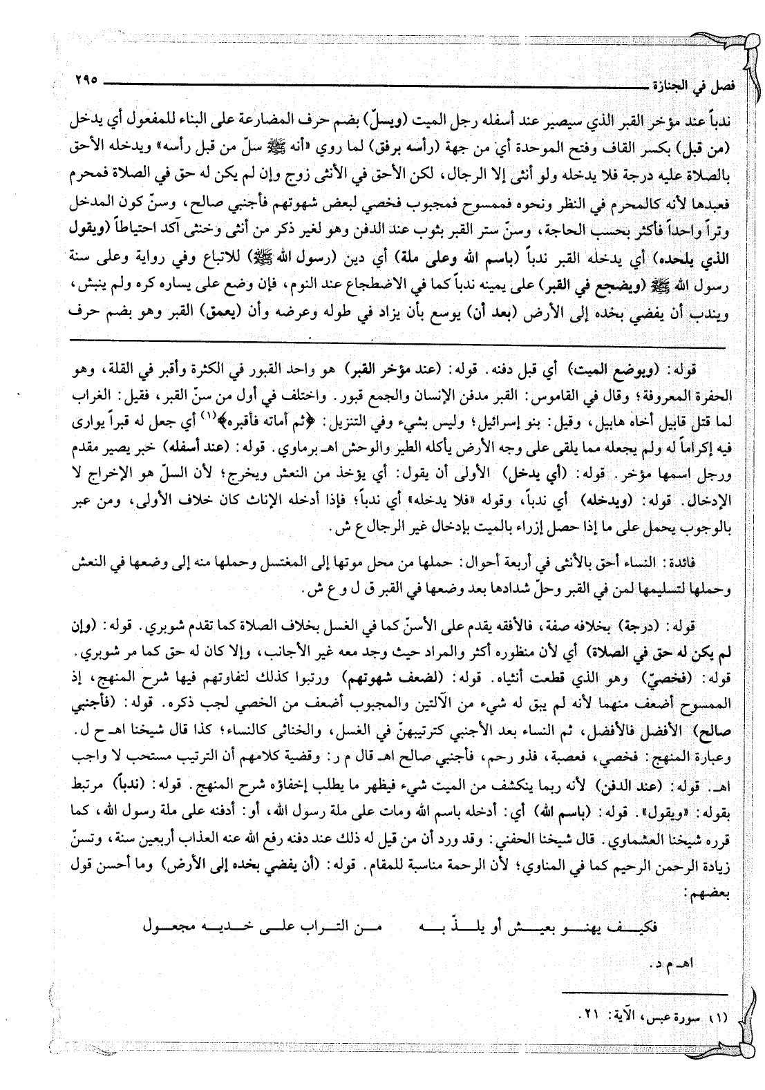نَدْبًا عِنْدَ مُؤَخَّرِ الْقَبْرِ الَّذِي سَيَصِيرُ عِنْدَ أَسْفَلِهِ رِجْلُ الْمَيِّتِ (وَيُسَلُّ) بِضَمِّ حَرْفِ الْمُضَارَعَةِ عَلَى الْبِنَاءِ لِلْمَفْعُولِ أَيْ يُدْخَلُ (مِنْ قِبَلِ) بِكَسْرِ الْقَافِ وَفَتْحِ الْمُوَحَّدَةِ أَيْ مِنْ جِهَةِ (رَأْسِهِ بِرِفْقٍ) لِمَا رُوِيَ «أَنَّهُ - صَلَّى اللَّهُ عَلَيْهِ وَسَلَّمَ - سُلَّ مِنْ قِبَلِ رَأْسِهِ» وَيُدْخِلُهُ الْأَحَقُّ بِالصَّلَاةِ عَلَيْهِ دَرَجَةً فَلَا يُدْخِلُهُ وَلَوْ أُنْثَى إلَّا الرِّجَالُ، لَكِنَّ الْأَحَقَّ فِي الْأُنْثَى زَوْجٌ وَإِنْ لَمْ يَكُنْ لَهُ حَقٌّ فِي الصَّلَاةِ فَمَحْرَمٌ فَعَبْدُهَا لِأَنَّهُ كَالْمَحْرَمِ فِي النَّظَرِ وَنَحْوِهِ فَمَمْسُوحٌ فَمَجْبُوبٌ فَخَصِيٌّ لِبَعْضِ شَهْوَتِهِمْ فَأَجْنَبِيٌّ صَالِحٌ، وَسُنَّ كَوْنُ الْمَدْخَلِ وِتْرًا وَاحِدًا فَأَكْثَرَ بِحَسَبِ الْحَاجَةِ، وَسُنَّ سَتْرُ الْقَبْرِ بِثَوْبٍ عِنْدَ الدَّفْنِ وَهُوَ لِغَيْرِ ذَكَرٍ مِنْ أُنْثَى وَخُنْثَى آكَدُ احْتِيَاطًا (وَيَقُولُ الَّذِي يَلْحَدُهُ) أَيْ يُدْخِلُهُ الْقَبْرَ نَدْبًا (بِاسْمِ اللَّهِ وَعَلَى مِلَّةِ) أَيْ دَيْنِ (رَسُولِ اللَّهِ - صَلَّى اللَّهُ عَلَيْهِ وَسَلَّمَ -) لِلِاتِّبَاعِ وَفِي رِوَايَةٍ وَعَلَى سُنَّةِ رَسُولِ اللَّهِ - صَلَّى اللَّهُ عَلَيْهِ وَسَلَّمَ - (وَيُضْجَعُ فِي الْقَبْرِ) عَلَى يَمِينِهِ نَدْبًا كَمَا فِي الِاضْطِجَاعِ عِنْدَ النَّوْمِ، فَإِنْ وُضِعَ عَلَى يَسَارِهِ كُرِهَ وَلَمْ يُنْبَشْ، وَيُنْدَبُ أَنْ يُفْضِيَ بِخَدِّهِ إلَى الْأَرْضِ (بَعْدَ أَنْ) يُوَسَّعَ بِأَنْ يُزَادَ فِي طُولِهِ وَعَرْضِهِ وَأَنْ (يُعَمَّقَ) الْقَبْرُ وَهُوَ بِضَمِّ حَرْفِ