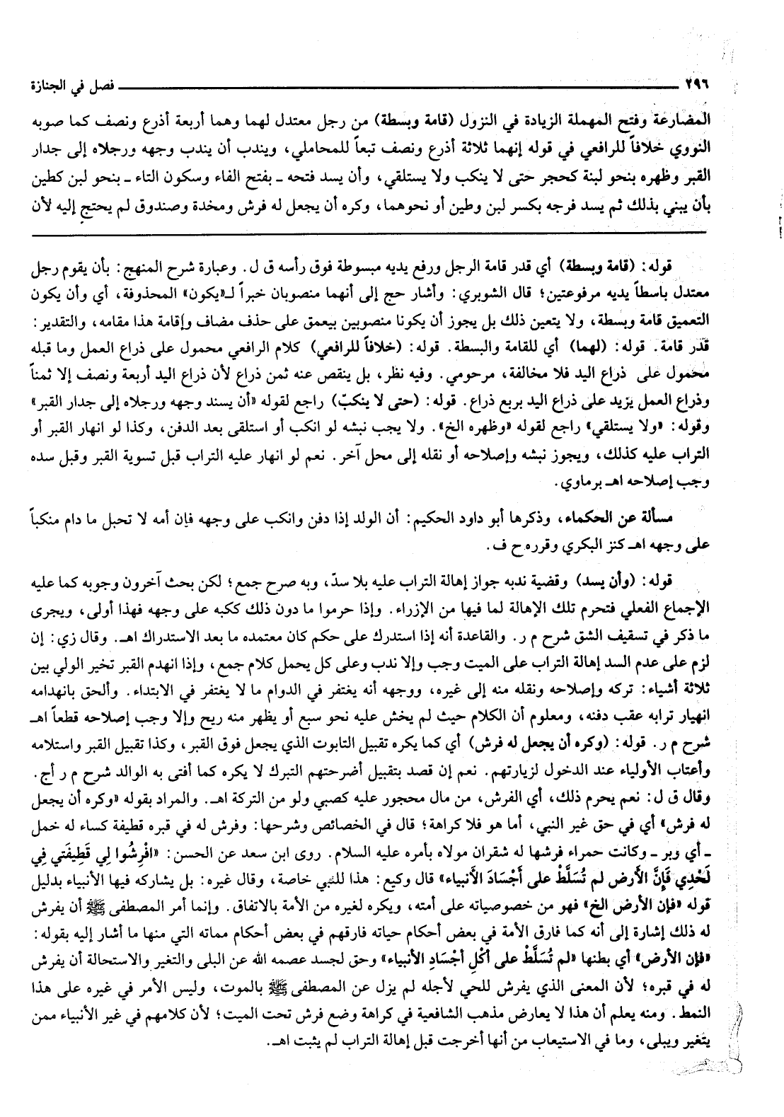 الْمُضَارَعَةِ وَفَتْحِ الْمُهْمَلَةِ الزِّيَادَةُ فِي النُّزُولِ (قَامَةً وَبَسْطَةً) مِنْ رَجُلٍ مُعْتَدِلٍ لَهُمَا وَهُمَا أَرْبَعَةُ أَذْرُعٍ وَنِصْفٌ كَمَا صَوَّبَهُ النَّوَوِيُّ خِلَافًا لِلرَّافِعِيِّ فِي قَوْلِهِ إنَّهُمَا ثَلَاثَةُ أَذْرُعٍ وَنِصْفٌ تَبَعًا لِلْمَحَامِلِيِّ، وَيُنْدَبُ أَنْ يُنْدَبُ وَجْهُهُ وَرِجْلَاهُ إلَى جِدَارِ الْقَبْرِ وَظَهْرُهُ بِنَحْوِ لَبِنَةٍ كَحَجَرٍ حَتَّى لَا يُنَكَّبَ وَلَا يَسْتَلْقِي، وَأَنْ يُسَدَّ فَتْحُهُ بِفَتْحِ الْفَاءِ وَسُكُونِ التَّاءِ بِنَحْوِ لَبِنٍ كَطِينٍ بِأَنْ يُبْنَى بِذَلِكَ ثُمَّ يُسَدُّ فَرْجُهُ بِكِسَرِ لَبِنٍ وَطِينٍ أَوْ نَحْوِهِمَا، وَكُرِهَ أَنْ يُجْعَلَ لَهُ فَرْشٌ وَمِخَدَّةٌ وَصُنْدُوقٌ لَمْ يُحْتَجْ إلَيْهِ لِأَنَّ