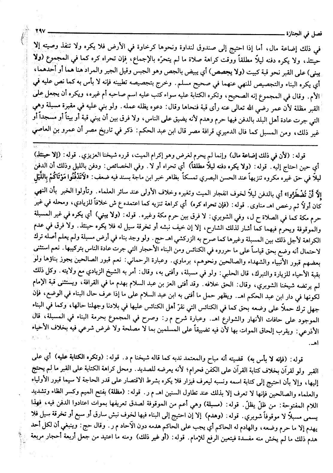 فِي ذَلِكَ إضَاعَةَ مَالٍ، أَمَّا إذَا اُحْتِيجَ إلَى صُنْدُوقٍ لِنَدَاوَةٍ وَنَحْوِهَا كَرَخَاوَةٍ فِي الْأَرْضِ فَلَا يُكْرَهُ وَلَا تُنَفَّذُ وَصِيَّتُهُ إلَّا حِينَئِذٍ، وَلَا يُكْرَهُ دَفْنُهُ لَيْلًا مُطْلَقًا وَوَقْتَ كَرَاهَةِ صَلَاةٍ مَا لَمْ يَتَحَرَّهُ بِالْإِجْمَاعِ، فَإِنْ تَحَرَّاهُ كُرِهَ كَمَا فِي الْمَجْمُوعِ (وَلَا يُبْنَى) عَلَى الْقَبْرِ نَحْوُ قُبَّةٍ كَبَيْتٍ (وَلَا يُجَصَّصُ) أَيْ يُبَيَّضُ بِالْجِصِّ وَهُوَ الْجِبْسُ وَقِيلَ: الْجِيرُ وَالْمُرَادُ هُنَا هُمَا أَوْ أَحَدُهُمَا، أَيْ يُكْرَهُ الْبِنَاءُ وَالتَّجْصِيصُ لِلنَّهْيِ عَنْهُمَا فِي صَحِيحِ مُسْلِمٍ. وَخَرَجَ بِتَجْصِيصِهِ تَطْيِينُهُ فَإِنَّهُ لَا بَأْسَ بِهِ كَمَا نَصَّ عَلَيْهِ فِي الْأُمِّ. وَقَالَ فِي الْمَجْمُوعِ: إنَّهُ الصَّحِيحُ، وَتُكْرَهُ الْكِتَابَةُ عَلَيْهِ سَوَاءٌ كُتِبَ عَلَيْهِ اسْمُ صَاحِبِهِ أَمْ غَيْرِهِ، وَيُكْرَهُ أَنْ يُجْعَلَ عَلَى الْقَبْرِ مِظَلَّةٌ لِأَنَّ عُمَرَ - رَضِيَ اللَّهُ تَعَالَى عَنْهُ - رَأَى قُبَّةً فَنَحَّاهَا وَقَالَ: دَعُوهُ يُظِلُّهُ عَمَلُهُ. وَلَوْ بُنِيَ عَلَيْهِ فِي مَقْبَرَةٍ مُسْبَلَةٌ وَهِيَ الَّتِي جَرَتْ عَادَةُ أَهْلِ الْبَلَدِ بِالدَّفْنِ فِيهَا حُرِّمَ وَهُدِمَ لِأَنَّهُ يُضَيِّقُ عَلَى النَّاسِ، وَلَا فَرْقَ بَيْنَ أَنْ يَبْنِي قُبَّةً أَوْ بَيْتًا أَوْ مَسْجِدًا أَوْ غَيْرَ ذَلِكَ، وَمِنْ الْمُسْبَلِ كَمَا قَالَ الدَّمِيرِيُّ قَرَافَةُ مِصْرَ قَالَ ابْنُ عَبْدِ الْحَكَمِ: ذُكِرَ فِي تَارِيخِ مِصْرَ أَنَّ عَمْرَو بْنَ الْعَاصِ