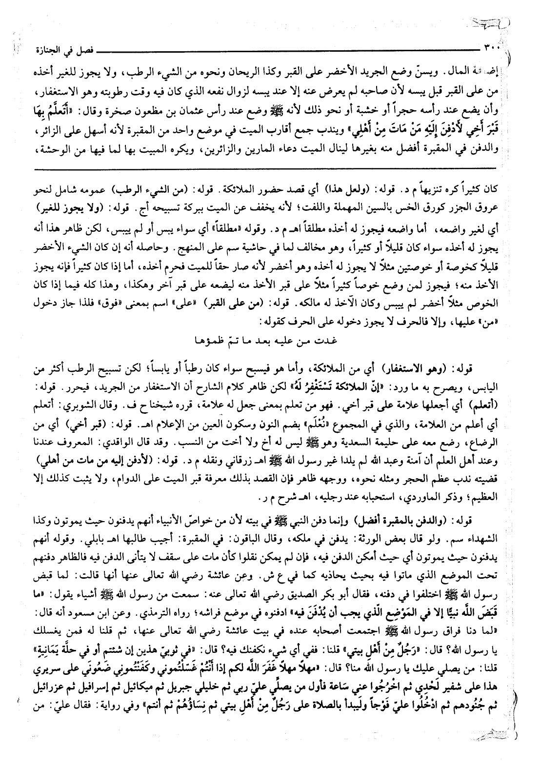 إضَاعَةِ الْمَالِ. وَيُسَنُّ وَضْعُ الْجَرِيدِ الْأَخْضَرِ عَلَى الْقَبْرِ وَكَذَا الرَّيْحَانُ وَنَحْوُهُ مِنْ الشَّيْءِ الرَّطْبِ، وَلَا يَجُوزُ لِلْغَيْرِ أَخْذُهُ مِنْ عَلَى الْقَبْرِ قَبْلَ يُبْسِهِ لِأَنَّ صَاحِبَهُ لَمْ يُعْرِضْ عَنْهُ إلَّا عِنْدَ يُبْسِهِ لِزَوَالِ نَفْعِهِ الَّذِي كَانَ فِيهِ وَقْتَ رُطُوبَتِهِ وَهُوَ الِاسْتِغْفَارُ، وَأَنْ يَضَعَ عِنْدَ رَأْسِهِ حَجَرًا أَوْ خَشَبَةً أَوْ نَحْوَ ذَلِكَ لِأَنَّهُ «- صَلَّى اللَّهُ عَلَيْهِ وَسَلَّمَ - وَضَعَ عِنْدَ رَأْسِ عُثْمَانَ بْنِ مَظْعُونٍ صَخْرَةً وَقَالَ: أَتَعَلَّمُ بِهَا قَبْرَ أَخِي لِأَدْفِنَ إلَيْهِ مَنْ مَاتَ مِنْ أَهْلِي» وَيُنْدَبُ جَمْعُ أَقَارِبِ الْمَيِّتِ فِي مَوْضِعٍ وَاحِدٍ مِنْ الْمَقْبَرَةِ لِأَنَّهُ أَسْهَلُ عَلَى الزَّائِرِ، وَالدَّفْنُ فِي الْمَقْبَرَةِ أَفْضَلُ مِنْهُ بِغَيْرِهَا لِيَنَالَ الْمَيِّتُ دُعَاءَ الْمَارِّينَ وَالزَّائِرِينَ، وَيُكْرَهُ الْمَبِيتُ بِهَا لِمَا فِيهَا مِنْ الْوَحْشَةِ