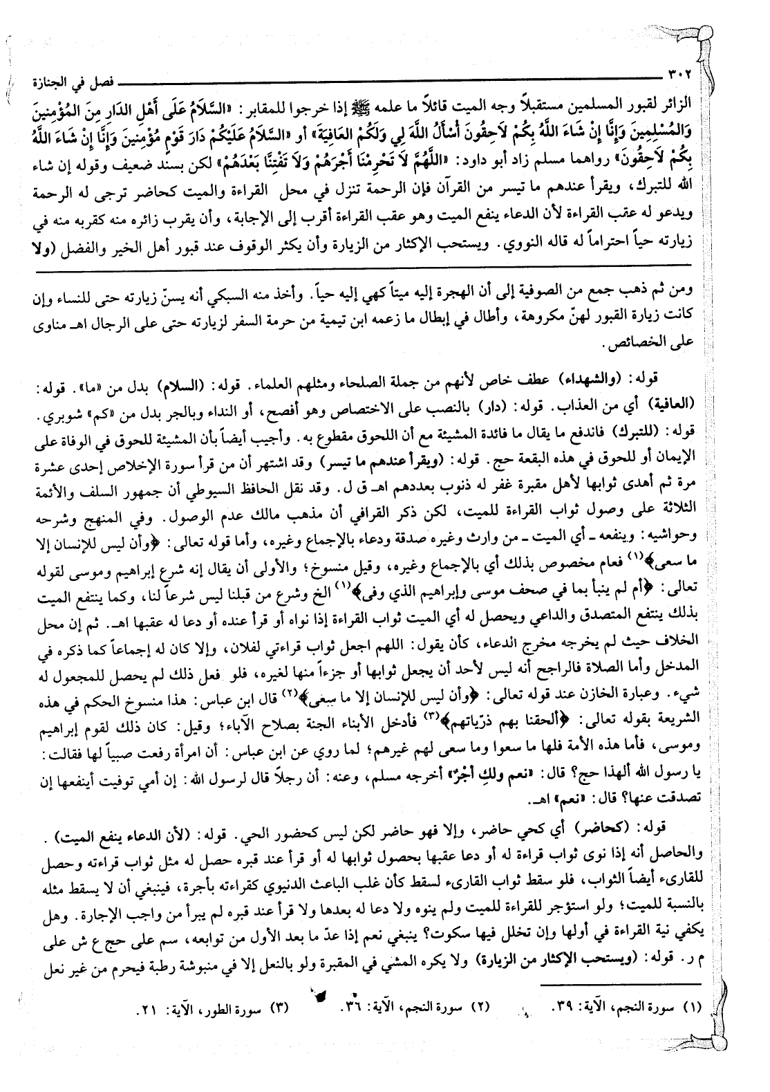 الزَّائِرُ لِقُبُورِ الْمُسْلِمِينَ مُسْتَقْبِلًا وَجْهَ الْمَيِّتِ قَائِلًا مَا عَلَّمَهُ - صَلَّى اللَّهُ عَلَيْهِ وَسَلَّمَ - لِأَصْحَابِهِ إذَا خَرَجُوا لِلْمَقَابِرِ: «السَّلَامُ عَلَى أَهْلِ الدَّارِ مِنْ الْمُؤْمِنِينَ وَالْمُسْلِمِينَ وَإِنَّا إنْ شَاءَ اللَّهُ بِكُمْ لَاحِقُونَ أَسْأَلُ اللَّهَ لِي وَلَكُمْ الْعَافِيَةَ» أَوْ «السَّلَامُ عَلَيْكُمْ دَارَ قَوْمٍ مُؤْمِنِينَ وَإِنَّا إنْ شَاءَ اللَّهُ بِكُمْ لَاحِقُونَ» رَوَاهُمَا مُسْلِمٌ وَزَادَ أَبُو دَاوُد «اللَّهُمَّ لَا تَحْرِمْنَا أَجْرَهُمْ وَلَا تَفْتِنَّا بَعْدَهُمْ» لَكِنْ بِسَنَدٍ ضَعِيفٍ وَقَوْلُهُ إنْ شَاءَ اللَّهُ لِلتَّبَرُّكِ، وَيَقْرَأُ عِنْدَهُمْ مَا تَيَسَّرَ مِنْ الْقُرْآنِ فَإِنَّ الرَّحْمَةَ تَنْزِلُ فِي مَحِلِّ الْقِرَاءَةِ وَالْمَيِّتُ كَحَاضِرٍ تُرْجَى لَهُ الرَّحْمَةُ وَيَدْعُو لَهُ عَقِبَ الْقِرَاءَةِ لِأَنَّ الدُّعَاءَ يَنْفَعُ الْمَيِّتَ وَهُوَ عَقِبُ الْقِرَاءَةِ أَقْرَبُ إلَى الْإِجَابَةِ، وَأَنْ يَقْرُبَ زَائِرَهُ مِنْهُ كَقُرْبِهِ مِنْهُ فِي زِيَارَتِهِ حَيًّا احْتِرَامًا لَهُ قَالَهُ النَّوَوِيُّ. وَيُسْتَحَبُّ الْإِكْثَارُ مِنْ الزِّيَارَةِ وَأَنْ يُكْثِرَ الْوُقُوفَ عِنْدَ قُبُورِ أَهْلِ الْخَيْرِ وَالْفَضْلِ