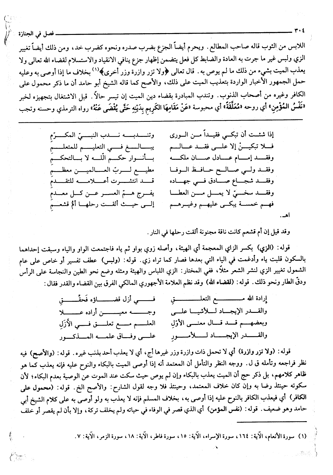 اللَّابِسِ مِنْ الثَّوْبِ قَالَهُ صَاحِبُ الْمَطَالِعِ. وَيَحْرُمُ أَيْضًا الْجَزَعُ بِضَرْبِ صَدْرِهِ وَنَحْوِهِ كَضَرْبِ خَدٍّ، وَمِنْ ذَلِكَ أَيْضًا تَغْيِيرُ الزِّيِّ وَلُبْسُ غَيْرِ مَا جَرَتْ بِهِ الْعَادَةُ وَالضَّابِطُ كُلُّ فِعْلٍ يَتَضَمَّنُ إظْهَارَ جَزَعٍ يُنَافِي الِانْقِيَادَ وَالِاسْتِسْلَامَ لِقَضَاءِ اللَّهِ تَعَالَى وَلَا يُعَذَّبُ الْمَيِّتُ بِشَيْءِ مِنْ ذَلِكَ مَا لَمْ يُوصِ بِهِ. قَالَ تَعَالَى {وَلا تَزِرُ وَازِرَةٌ وِزْرَ أُخْرَى} [الأنعام: 164] بِخِلَافِ مَا إذَا أَوْصَى بِهِ وَعَلَيْهِ حَمَلَ الْجُمْهُورُ الْأَخْبَارَ الْوَارِدَةَ بِتَعْذِيبِ الْمَيِّتِ عَلَى ذَلِكَ، وَالْأَصَحُّ كَمَا قَالَهُ الشَّيْخُ أَبُو حَامِدٍ أَنَّ مَا ذُكِرَ مَحْمُولٌ عَلَى الْكَافِرِ وَغَيْرِهِ مِنْ أَصْحَابِ الذُّنُوبِ. وَتُنْدَبُ الْمُبَادَرَةُ بِقَضَاءِ دَيْنِ الْمَيِّتِ إنْ تَيَسَّرَ حَالًا. قَبْلَ الِاشْتِغَالِ بِتَجْهِيزِهِ لِخَبَرِ «نَفْسُ الْمُؤْمِنِ أَيْ رُوحُهُ مُعَلَّقَةٌ أَيْ مَحْبُوسَةٌ عَنْ مَقَامِهَا الْكَرِيمِ بِدَيْنِهِ حَتَّى يُقْضَى عَنْهُ» رَوَاهُ التِّرْمِذِيُّ وَحَسَّنَهُ وَتَجِبُ