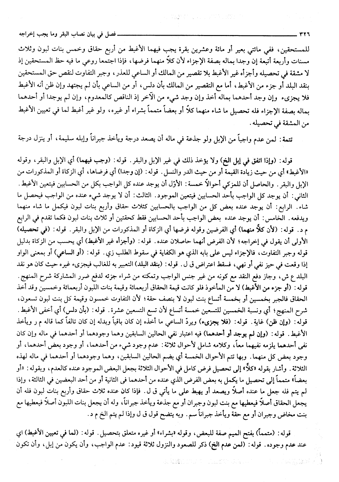فَإِذَا كَانَ عِنْدَهُ ثَلَاثُ حِقَاقٍ وَأَرْبَعُ بَنَاتِ لَبُونٍ فَلَهُ أَنْ يَجْعَلَ الْحِقَاقَ أَصْلًا فَيُعْطِيهَا مَعَ بِنْتِ لَبُونٍ وَجُبْرَانٍ أَوْ مَعَ جَذَعَةٍ وَيَأْخُذُ جُبْرَانًا، وَلَهُ أَنْ يَجْعَلَ بَنَاتِ اللَّبُونِ أَصْلًا فَيُعْطِيهَا مَعَ بِنْتِ مَخَاضٍ وَجُبْرَانٍ أَوْ مَعَ حِقَّةٍ وَيَأْخُذُ جُبْرَانًا سم. وَبِهِ يَتَّضِحُ قَوْلُ ق ل وَإِذَا لَمْ يَتِمَّ إلَخْ م د. قَوْلُهُ: (مُتَمَّمًا) بِفَتْحِ الْمِيمِ صِفَةٌ لِلْبَعْضِ، وَقَوْلُهُ " بِشِرَاءٍ " أَوْ غَيْرِهِ مُتَعَلِّقٌ بِتَحْصِيلٍ.