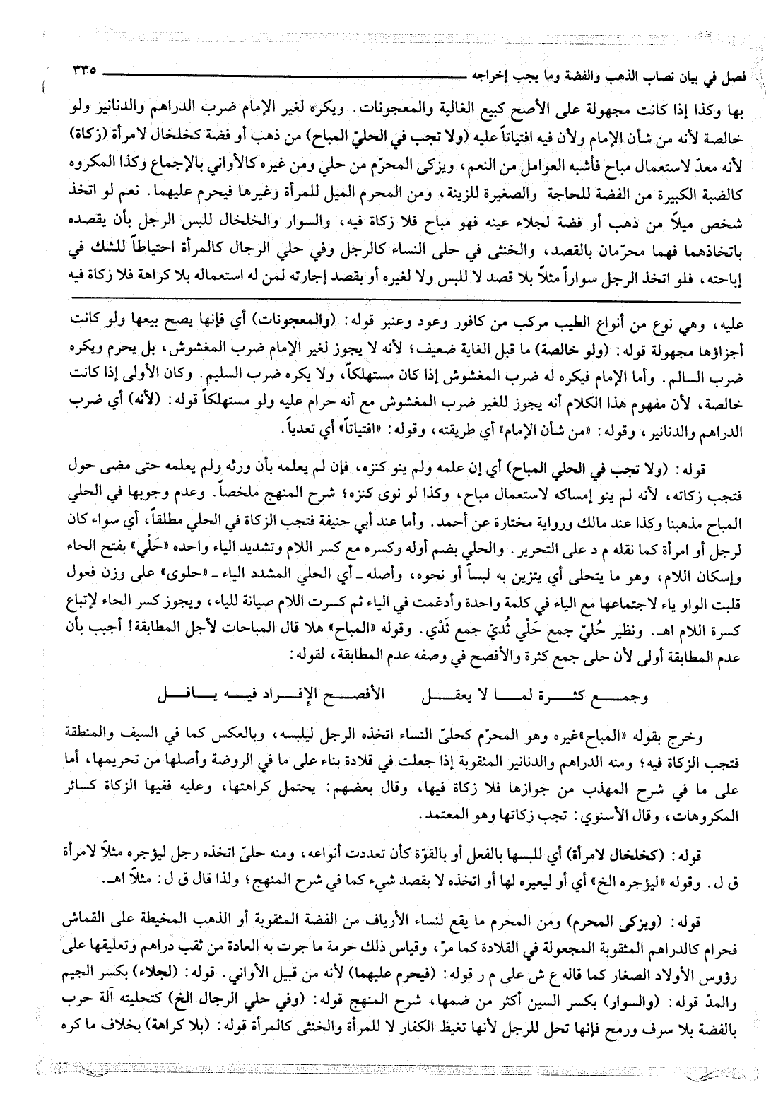 وَالْحُلِيُّ بِضَمِّ أَوَّلِهِ وَكَسْرِهِ مَعَ كَسْرِ اللَّامِ وَتَشْدِيدِ الْيَاءِ وَاحِدُهُ " حَلْيٌ " بِفَتْحِ الْحَاءِ وَإِسْكَانِ اللَّامِ، وَهُوَ مَا يَتَحَلَّى أَيْ يُتَزَيَّنُ بِهِ لُبْسًا أَوْ نَحْوَهُ، وَأَصْلُهُ أَيْ الْحُلِيِّ الْمُشَدَّدِ الْيَاءِ " حَلُوي " عَلَى وَزْنِ فَعُولٍ قُلِبَتْ الْوَاوُ يَاءً لِاجْتِمَاعِهَا مَعَ الْيَاءِ فِي كَلِمَةٍ وَاحِدَةٍ وَأُدْغِمَتْ فِي الْيَاءِ ثُمَّ كُسِرَتْ اللَّامُ صِيَانَةً لِلْيَاءِ، وَيَجُوزُ كَسْرُ الْحَاءِ لِإِتْبَاعِ كَسْرَةِ اللَّامِ اهـ. وَنَظِيرُ حُلِيٍّ جَمْعُ حَلْيٍ ثُدِيٌّ جَمْعُ ثَدْيٍ. وَقَوْلُهُ " الْمُبَاحِ " هَلَّا قَالَ الْمُبَاحَاتِ لِأَجْلِ الْمُطَابَقَةِ، أُجِيبُ بِأَنَّ عَدَمَ الْمُطَابَقَةِ أَوْلَى لِأَنَّ حُلِيًّا جَمْعُ كَثْرَةٍ وَالْأَفْصَحُ فِي وَصْفِهِ عَدَمُ الْمُطَابَقَةِ، لِقَوْلِهِ:
