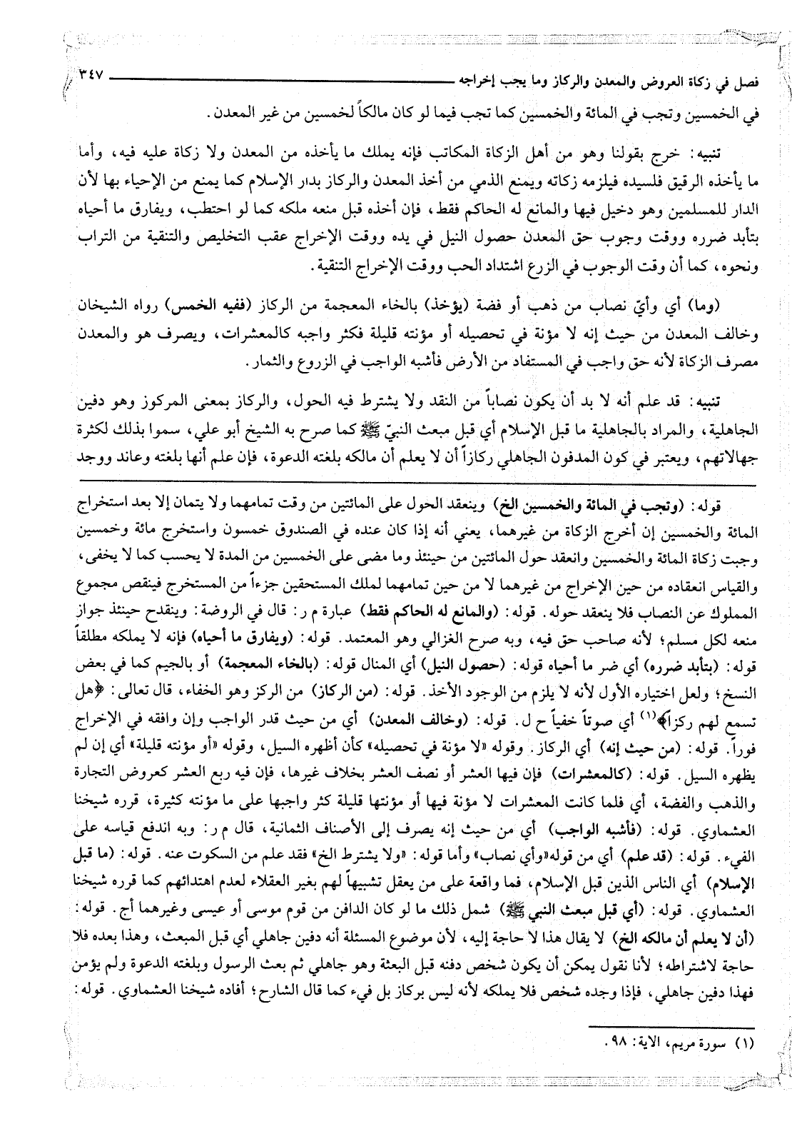 تَنْبِيهٌ: قَدْ عُلِمَ أَنَّهُ لَا بُدَّ أَنْ يَكُونَ نِصَابًا مِنْ النَّقْدِ وَلَا يُشْتَرَطُ فِيهِ الْحَوْلُ، وَالرِّكَازُ بِمَعْنَى الْمَرْكُوزِ وَهُوَ دَفِينُ الْجَاهِلِيَّةِ، وَالْمُرَادُ بِالْجَاهِلِيَّةِ مَا قَبْلَ الْإِسْلَامِ أَيْ قَبْلَ مَبْعَثِ النَّبِيِّ - صَلَّى اللَّهُ عَلَيْهِ وَسَلَّمَ - كَمَا صَرَّحَ بِهِ الشَّيْخُ أَبُو عَلِيٍّ، سُمُّوا بِذَلِكَ لِكَثْرَةِ جَهَالَاتِهِمْ، وَيُعْتَبَرُ فِي كَوْنِ الْمَدْفُونِ الْجَاهِلِيِّ رِكَازًا أَنْ لَا يُعْلَمَ أَنَّ مَالِكَهُ بَلَغَتْهُ الدَّعْوَةُ، فَإِنْ عُلِمَ أَنَّهَا بَلَغَتْهُ وَعَانَدَ وَوُجِدَ