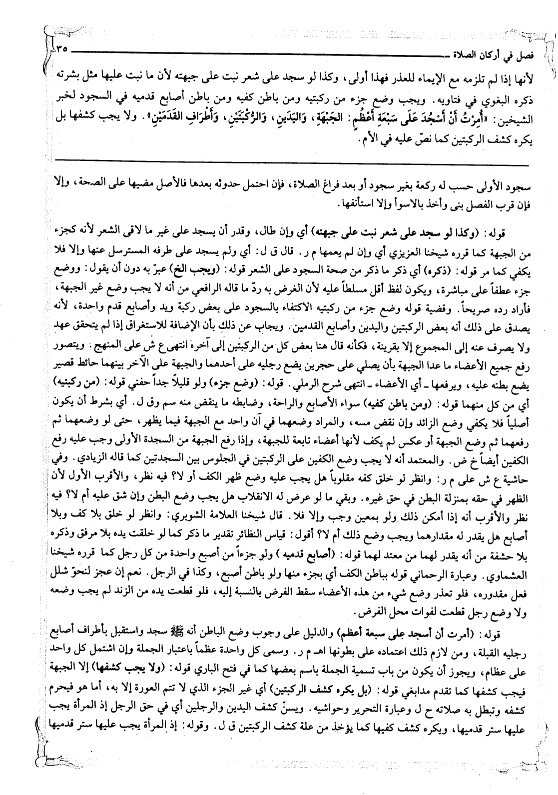 قَالَ شَيْخُنَا الْعَلَّامَةُ الشَّوْبَرِيُّ: وَانْظُرْ لَوْ خُلِقَ بِلَا كَفٍّ وَبِلَا أَصَابِعَ هَلْ يُقَدِّرُ لَهُ مِقْدَارَهُمَا وَيَجِبُ وَضْعُ ذَلِكَ أَمْ لَا؟ أَقُولُ: قِيَاسُ النَّظَائِرِ تَقْدِيرُ مَا ذَكَرَ كَمَا لَوْ خُلِقَتْ يَدُهُ بِلَا مِرْفَقٍ وَذَكَرُهُ بِلَا حَشَفَةٍ مِنْ أَنَّهُ يُقَدِّرُ لَهُمَا مِنْ مُعْتَدِلِهِمَا قَوْلُهُ: (أَصَابِعِ قَدَمَيْهِ) وَلَوْ جُزْءًا مِنْ أُصْبُعٍ وَاحِدَةٍ مِنْ كُلِّ رِجْلٍ كَمَا قَرَّرَهُ شَيْخُنَا الْعَشْمَاوِيُّ. وَعِبَارَةُ الرَّحْمَانِيِّ قَوْلُهُ بِبَاطِنِ الْكَفِّ أَيْ بِجُزْءٍ مِنْهَا وَلَوْ بَاطِنَ أُصْبُعٍ، كَذَا فِي الرَّجْلِ. نَعَمْ إنْ عَجَزَ لِنَحْوِ شَلَلٍ فَعَلَ مَقْدُورَهُ، فَلَوْ تَعَذَّرَ وَضْعُ شَيْءٍ مِنْ هَذِهِ الْأَعْضَاءِ سَقَطَ الْفَرْضُ بِالنِّسْبَةِ إلَيْهِ، فَلَوْ قُطِعَتْ يَدُهُ مِنْ الزَّنْدِ لَمْ يَجِبْ وَضْعُهُ وَلَا وَضْعُ رِجْلٍ قُطِعَتْ لِفَوَاتِ مَحَلِّ الْفَرْضِ. قَوْلُهُ: «أُمِرْت أَنْ أَسْجُدَ عَلَى سَبْعَةِ أَعْظُمٍ» وَالدَّلِيلُ عَلَى وُجُوبِ وَضْعِ الْبَاطِنِ «أَنَّهُ - صَلَّى اللَّهُ عَلَيْهِ وَسَلَّمَ - سَجَدَ وَاسْتَقْبَلَ بِأَطْرَافِ أَصَابِعِ رِجْلَيْهِ الْقِبْلَةَ» ، وَمِنْ لَازِمِ ذَلِكَ اعْتِمَادُهُ عَلَى بُطُونِهَا. اهـ. م ر. وَسَمَّى كُلَّ وَاحِدَةٍ عَظْمًا بِاعْتِبَارِ الْجُمْلَةِ وَإِنْ اشْتَمَلَ كُلُّ وَاحِدٍ عَلَى عِظَامٍ، وَيَجُوزُ أَنْ يَكُونَ مِنْ بَابِ تَسْمِيَةِ الْجُمْلَةِ بِاسْمِ بَعْضِهَا كَمَا فِي فَتْحِ الْبَارِي قَوْلُهُ: (وَلَا يَجِبُ كَشْفُهَا) إلَّا الْجَبْهَةَ فَيَجِبُ كَشْفُهَا كَمَا تَقَدَّمَ مَدَابِغِيٌّ قَوْلُهُ: (بَلْ يُكْرَهُ كَشْفُ الرُّكْبَتَيْنِ) أَيْ غَيْرَ الْجُزْءِ الَّذِي لَا تَتِمُّ الْعَوْرَةُ إلَّا بِهِ، أَمَّا هُوَ فَيَحْرُمُ كَشْفُهُ وَتَبْطُلُ بِهِ صَلَاتُهُ ح ل وَعِبَارَةُ التَّحْرِيرِ وَحَوَاشِيهِ. وَيُسَنُّ كَشْفُ الْيَدَيْنِ وَالرِّجْلَيْنِ أَيْ فِي حَقِّ الرَّجُلِ إذْ الْمَرْأَةُ يَجِبُ عَلَيْهَا سَتْرُ قَدَمَيْهَا، وَيُكْرَهُ كَشْفُ كَفَّيْهَا كَمَا يُؤْخَذُ مِنْ عِلَّةِ كَشْفِ الرُّكْبَتَيْنِ ق ل. وَقَوْلُهُ: إذْ الْمَرْأَةُ يَجِبُ عَلَيْهَا سَتْرُ قَدَمَيْهَا