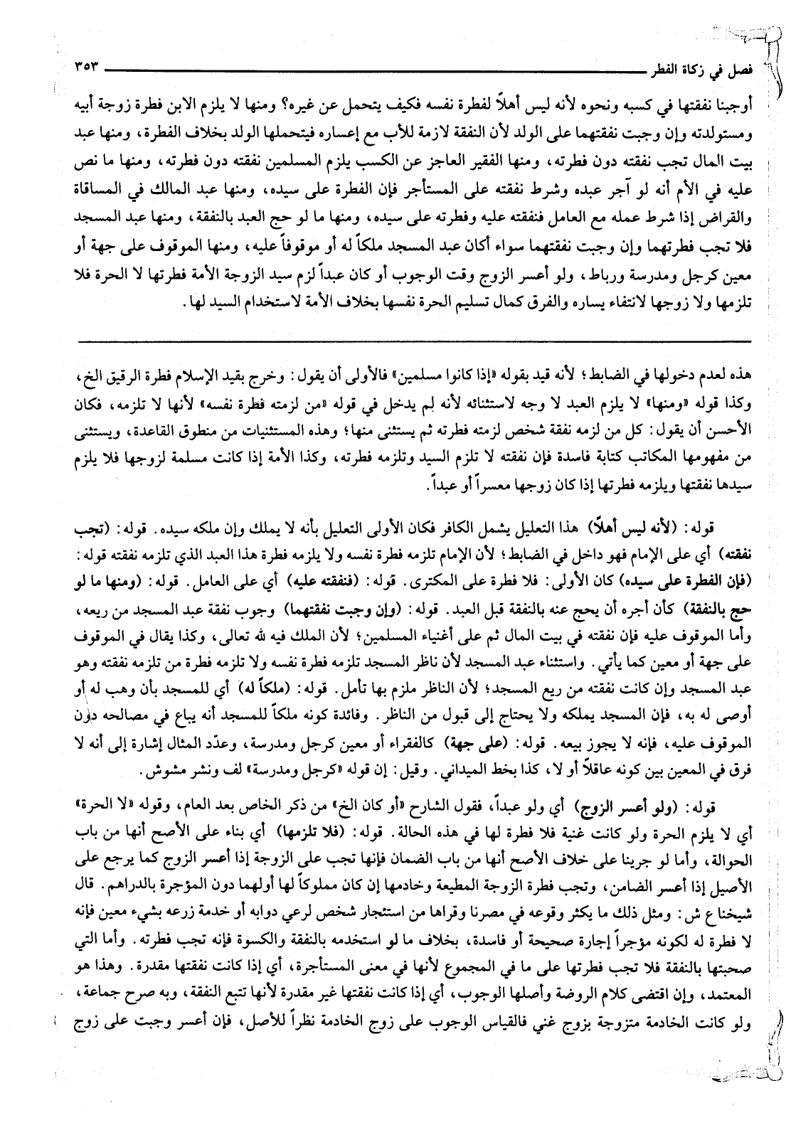أَوْجَبْنَا نَفَقَتَهَا فِي كَسْبِهِ وَنَحْوِهِ لِأَنَّهُ لَيْسَ أَهْلًا لِفِطْرَةِ نَفْسِهِ فَكَيْفَ يَتَحَمَّلُ عَنْ غَيْرِهِ؟ وَمِنْهَا لَا يَلْزَمُ الِابْنَ فِطْرَةُ زَوْجَةِ أَبِيهِ وَمُسْتَوْلِدَتِهِ وَإِنْ وَجَبَتْ نَفَقَتُهُمَا عَلَى الْوَلَدِ لِأَنَّ النَّفَقَةَ لَازِمَةٌ لِلْأَبِ مَعَ إعْسَارِهِ فَيَتَحَمَّلُهَا الْوَلَدُ بِخِلَافِ الْفِطْرَةِ، وَمِنْهَا عَبْدُ بَيْتِ الْمَالِ تَجِبُ نَفَقَتُهُ دُونَ فِطْرَتِهِ، وَمِنْهَا الْفَقِيرُ الْعَاجِزُ عَنْ الْكَسْبِ يَلْزَمُ الْمُسْلِمِينَ نَفَقَتُهُ دُونَ فِطْرَتِهِ، وَمِنْهَا مَا نَصَّ عَلَيْهِ فِي الْأُمِّ أَنَّهُ لَوْ آجَرَ عَبْدَهُ وَشَرَطَ نَفَقَتَهُ عَلَى الْمُسْتَأْجِرِ فَإِنَّ الْفِطْرَةَ عَلَى سَيِّدِهِ، وَمِنْهَا عَبْدُ الْمَالِكِ فِي الْمُسَاقَاةِ وَالْقِرَاضِ إذَا شَرَطَ عَمَلَهُ مَعَ الْعَامِلِ فَنَفَقَتُهُ عَلَيْهِ وَفِطْرَتُهُ عَلَى سَيِّدِهِ، وَمِنْهَا مَا لَوْ حَجَّ الْعَبْدُ بِالنَّفَقَةِ، وَمِنْهَا عَبْدُ الْمَسْجِدِ فَلَا تَجِبُ فِطْرَتُهُمَا، وَإِنْ وَجَبَتْ نَفَقَتُهُمَا سَوَاءٌ أَكَانَ عَبْدُ الْمَسْجِدِ مِلْكًا لَهُ أَوْ مَوْقُوفًا عَلَيْهِ، وَمِنْهَا الْمَوْقُوفُ عَلَى جِهَةٍ أَوْ مُعَيَّنٍ كَرَجُلٍ وَمَدْرَسَةٍ وَرِبَاطٍ.