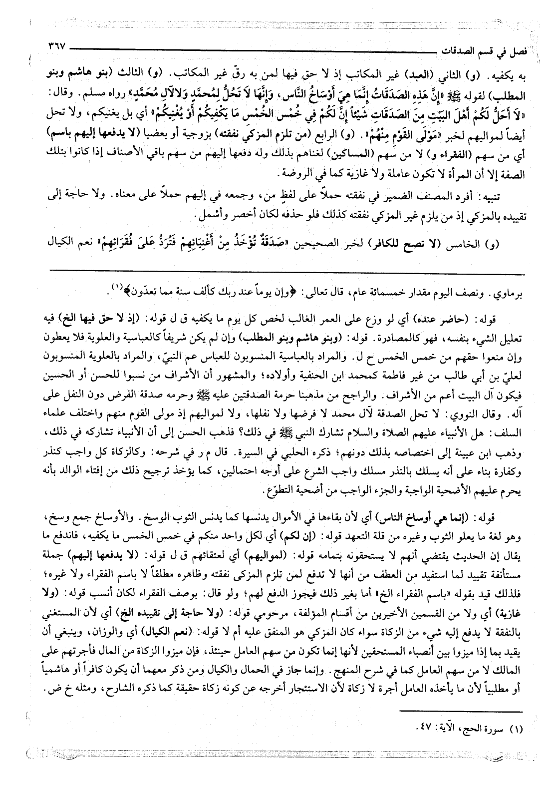 قَوْلُهُ: (وَبَنُو هَاشِمٍ وَبَنُو الْمُطَّلِبِ) وَإِنْ لَمْ يَكُنْ شَرِيفًا كَالْعَبَّاسِيَّةِ وَالْعَلَوِيَّةِ فَلَا يُعْطَوْنَ وَإِنْ مُنِعُوا حَقَّهُمْ مِنْ خُمُسِ الْخُمُسِ ح ل. وَالْمُرَادُ بِالْعَبَّاسِيَّةِ الْمَنْسُوبُونَ لِلْعَبَّاسِ عَمِّ النَّبِيِّ، وَالْمُرَادُ بِالْعَلَوِيَّةِ الْمَنْسُوبُونَ لِعَلِيٍّ بْنِ أَبِي طَالِبٍ مِنْ غَيْرِ فَاطِمَةَ كَمُحَمَّدِ ابْنِ الْحَنَفِيَّةِ وَأَوْلَادِهِ؛ وَالْمَشْهُورُ أَنَّ الْأَشْرَافَ مَنْ نُسِبُوا لِلْحَسَنِ أَوْ الْحُسَيْنِ فَيَكُونُ آلُ الْبَيْتِ أَعَمَّ مِنْ الْأَشْرَافِ. وَالرَّاجِحُ مِنْ مَذْهَبِنَا حُرْمَةُ الصَّدَقَتَيْنِ عَلَيْهِ - صَلَّى اللَّهُ عَلَيْهِ وَسَلَّمَ - وَحُرْمَةُ صَدَقَةِ الْفَرْضِ دُونَ النَّفْلِ عَلَى آلِهِ. وَقَالَ النَّوَوِيُّ: لَا تَحِلُّ الصَّدَقَةُ لِآلِ مُحَمَّدٍ لَا فَرْضُهَا وَلَا نَفْلُهَا، وَلَا لِمَوَالِيهِمْ إذْ مَوْلَى الْقَوْمِ مِنْهُمْ وَاخْتَلَفَ عُلَمَاءُ السَّلَفِ: هَلْ الْأَنْبِيَاءُ - عَلَيْهِمْ الصَّلَاةُ وَالسَّلَامُ - تُشَارِكُ النَّبِيَّ - صَلَّى اللَّهُ عَلَيْهِ وَسَلَّمَ - فِي ذَلِكَ؟ فَذَهَبَ الْحَسَنُ إلَى أَنَّ الْأَنْبِيَاءَ تُشَارِكُهُ فِي ذَلِكَ، وَذَهَبَ ابْنُ عُيَيْنَةَ إلَى اخْتِصَاصِهِ بِذَلِكَ دُونَهُمْ؛ ذَكَرَهُ الْحَلَبِيُّ فِي السِّيرَةِ. قَالَ م ر فِي شَرْحِهِ: وَكَالزَّكَاةِ كُلُّ وَاجِبٍ كَنَذْرٍ وَكَفَّارَةٍ بِنَاءً عَلَى أَنَّهُ يَسْلُكُ بِالنَّذْرِ مَسْلَكَ وَاجِبِ الشَّرْعِ عَلَى أَوْجَهِ احْتِمَالَيْنِ، كَمَا يُؤْخَذُ تَرْجِيحُ ذَلِكَ مِنْ إفْتَاءِ الْوَالِدِ بِأَنَّهُ يَحْرُمُ عَلَيْهِمْ الْأُضْحِيَّةُ الْوَاجِبَةُ وَالْجُزْءُ الْوَاجِبُ مِنْ أُضْحِيَّةِ التَّطَوُّعِ.