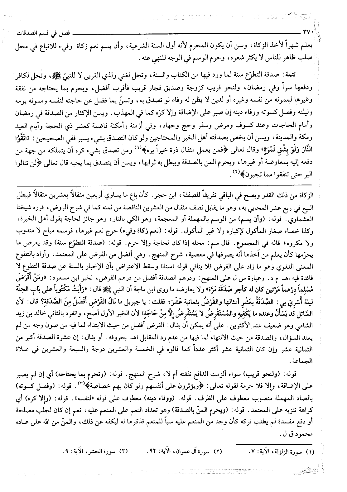 قَوْلُهُ: (وَيَحْرُمُ الْمَنُّ بِالصَّدَقَةِ) وَهُوَ تَعْدَادُ النِّعَمِ عَلَى الْمُنْعَمَ عَلَيْهِ، نَعَمْ إنْ كَانَ لِجَلْبِ مَصْلَحَةٍ أَوْ دَفْعِ مَفْسَدَةٍ لَمْ يُطْلَبْ تَرْكُهُ كَأَنْ وَجَدَ مِنْ الْمُنْعَمِ عَلَيْهِ سَبًّا لِلْمُنْعِمِ فَذَكَرَهَا لَهُ لِيَكُفَّهُ عَنْ ذَلِكَ، وَالْمَنُّ مِنْ اللَّهِ عَلَى عِبَادِهِ مَحْمُودٌ ق ل.