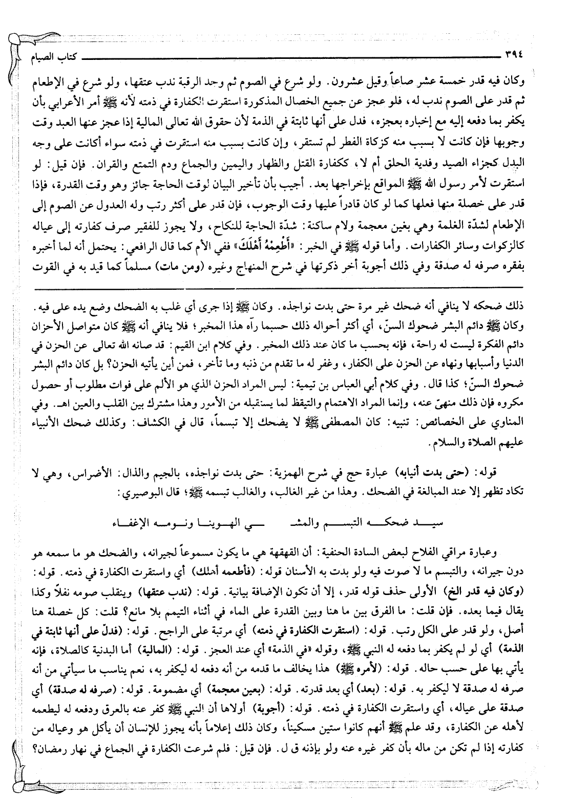 وَعِبَارَةُ مُرَاقِيٍّ الْفَلَّاحِ لِبَعْضِ السَّادَةِ الْحَنَفِيَّةِ: أَنَّ الْقَهْقَهَةَ هِيَ مَا يَكُونُ مَسْمُوعًا لِجِيرَانِهِ، وَالضَّحِكُ هُوَ مَا سَمِعَهُ هُوَ دُونَ جِيرَانِهِ، وَالتَّبَسُّمُ مَا لَا صَوْتَ فِيهِ وَلَوْ بَدَتْ بِهِ الْأَسْنَانُ قَوْلُهُ: (فَأَطْعِمْهُ أَهْلَكَ) أَيْ وَاسْتَقَرَّتْ الْكَفَّارَةُ فِي ذِمَّتِهِ.