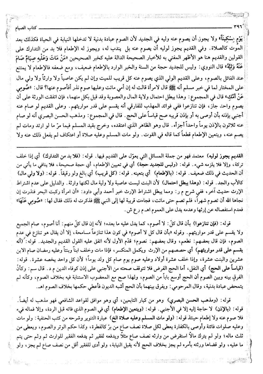 يَوْمٍ مِسْكِينًا» وَلَا يَجُوزُ أَنْ يَصُومَ عَنْهُ وَلِيُّهُ فِي الْجَدِيدِ لِأَنَّ الصَّوْمَ عِبَادَةٌ بَدَنِيَّةٌ لَا تَدْخُلُهَا النِّيَابَةُ فِي الْحَيَاةِ فَكَذَلِكَ بَعْدَ الْمَوْتِ كَالصَّلَاةِ. وَفِي الْقَدِيمِ يَجُوزُ لِوَلِيِّهِ أَنْ يَصُومَ عَنْهُ بَلْ يُنْدَبُ لَهُ، وَيَجُوزُ لَهُ الْإِطْعَامُ فَلَا بُدَّ مِنْ التَّدَارُكِ عَلَى الْقَوْلَيْنِ وَالْقَدِيمُ هُنَا هُوَ الْأَظْهَرُ الْمُفْتَى بِهِ لِلْأَخْبَارِ الصَّحِيحَةِ الدَّالَّةِ عَلَيْهِ كَخَبَرِ الصَّحِيحَيْنِ «مَنْ مَاتَ وَعَلَيْهِ صِيَامٌ صَامَ عَنْهُ وَلِيُّهُ» قَالَ النَّوَوِيُّ: وَلَيْسَ لِلْجَدِيدِ حُجَّةٌ مِنْ السُّنَّةِ، وَالْخَبَرُ الْوَارِدُ بِالْإِطْعَامِ ضَعِيفٌ، وَمَعَ ضَعْفِهِ فَالْإِطْعَامُ لَا يَمْتَنِعُ عِنْدَ الْقَائِلِ بِالصَّوْمِ، وَعَلَى الْقَدِيمِ الْوَلِيُّ الَّذِي يَصُومُ عَنْهُ كُلُّ قَرِيبٍ لِلْمَيِّتِ، وَإِنْ لَمْ يَكُنْ عَاصِيًا وَلَا وَارِثًا وَلَا وَلِيَّ مَالٍ عَلَى الْمُخْتَارِ لِمَا فِي خَبَرِ مُسْلِمٍ أَنَّهُ - صَلَّى اللَّهُ عَلَيْهِ وَسَلَّمَ - «قَالَ لِامْرَأَةٍ قَالَتْ لَهُ: إنَّ أُمِّي مَاتَتْ وَعَلَيْهَا صَوْمُ نَذْرٍ أَفَأَصُومُ عَنْهَا؟ قَالَ: صُومِي عَنْ أُمِّك» قَالَ فِي الْمَجْمُوعِ: وَهَذَا يُبْطِلُ احْتِمَالَ وِلَايَةِ الْمَالِ وَالْعُصُوبَةِ وَقَدْ قِيلَ بِكُلٍّ مِنْهُمَا، فَإِنْ اتَّفَقَتْ الْوَرَثَةُ عَلَى أَنْ يَصُومَ وَاحِدٌ جَازَ، فَإِنْ تَنَازَعُوا فَفِي فَوَائِدِ الْمُهَذَّبِ لِلْفَارِقِيِّ أَنَّهُ يُقَسَّمُ عَلَى قَدْرِ مَوَارِيثِهِمْ. وَعَلَى الْقَدِيمِ لَوْ صَامَ عَنْهُ أَجْنَبِيٌّ بِإِذْنِهِ بِأَنْ أَوْصَى بِهِ أَوْ بِإِذْنِ قَرِيبِهِ صَحَّ قِيَاسًا عَلَى الْحَجِّ. قَالَ فِي الْمَجْمُوعِ: وَمَذْهَبُ الْحَسَنِ الْبَصْرِيِّ أَنَّهُ لَوْ صَامَ عَنْهُ ثَلَاثُونَ بِالْإِذْنِ يَوْمًا وَاحِدًا أَجْزَأَهُ. قَالَ وَهُوَ الظَّاهِرُ الَّذِي اعْتَقَدَهُ، وَخَرَجَ بِقَيْدِ الْمُسْلِمِ فِيمَا مَرَّ مَا لَوْ ارْتَدَّ وَمَاتَ لَمْ يَصُمْ عَنْهُ، وَيَتَعَيَّنُ الْإِطْعَامُ قَطْعًا كَمَا قَالَهُ فِي الْقُوتِ. وَلَوْ مَاتَ الْمُسْلِمُ وَعَلَيْهِ صَلَاةٌ أَوْ اعْتِكَافٌ لَمْ يُفْعَلْ ذَلِكَ عَنْهُ وَلَا