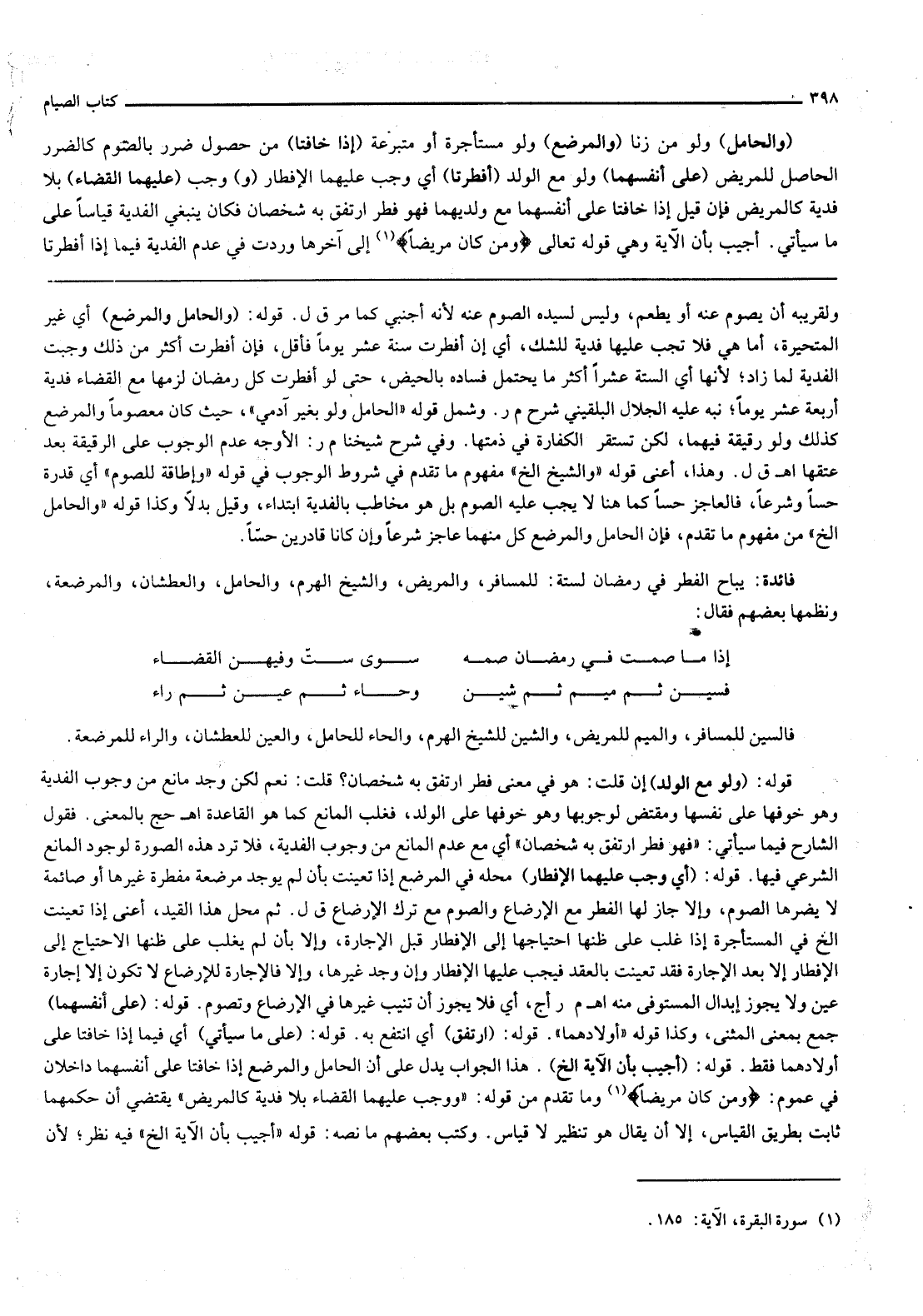 قَوْلُهُ: (أُجِيبَ بِأَنَّ الْآيَةَ إلَخْ) . هَذَا الْجَوَابُ يَدُلُّ عَلَى أَنَّ الْحَامِلَ وَالْمُرْضِعَ إذَا خَافَتَا عَلَى أَنْفُسِهِمَا دَاخِلَانِ فِي عُمُومِ: {وَمَنْ كَانَ مَرِيضًا} [البقرة: 185] وَمَا تَقَدَّمَ مِنْ قَوْلِهِ: " وَوَجَبَ عَلَيْهِمَا الْقَضَاءُ بِلَا فِدْيَةٍ كَالْمَرِيضِ " يَقْتَضِي أَنَّ حُكْمَهُمَا ثَابِتٌ بِطَرِيقِ الْقِيَاسِ، إلَّا أَنْ يُقَالَ هُوَ تَنْظِيرٌ لَا قِيَاسٌ. وَكَتَبَ بَعْضُهُمْ مَا نَصُّهُ: قَوْلُهُ: " أُجِيبَ بِأَنَّ الْآيَةَ إلَخْ " فِيهِ نَظَرٌ؛ لِأَنَّ
